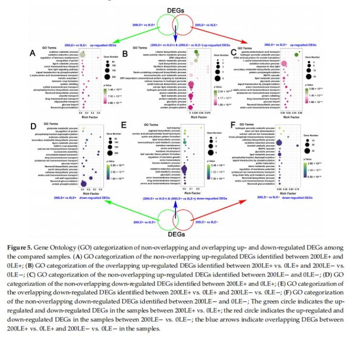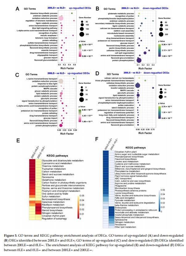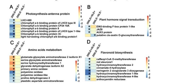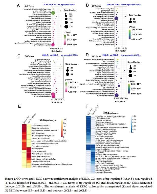 E.gansuensis上調1269個(gè)基因,下調1195個(gè)0LE+基因(葉E+植物在0mMNaCl下)與0LE-(E-植物在0mMNaCl下的葉子)相比。類(lèi)似地,E.gansuensis誘導844個(gè)基因并抑制200LE+(E+植物的葉子)的973個(gè)基因在200mMNaCl下)與200LE-(E-植物的葉子在200mMNaCl下)相比(圖1)。目前的結果表明在NaCl脅迫下E.gansuensis對基因的調控有巨大的影響與200mMNaCl相比。對0LE+和0LE-之間的DEGs進(jìn)行GO富集分析發(fā)現,E.gansuensis主要誘導“鈉離子跨膜轉運”、“胚胎后發(fā)育的正調控”、“蛋白質(zhì)磷酸化”、“光系統化學(xué)計量調整”和“谷氨酸代謝過(guò)程”(圖2A)。此外,GO富集分析表明,類(lèi)別“類(lèi)黃酮葡萄糖醛酸化”、“類(lèi)黃酮生物合成過(guò)程”、“氧化-還原”過(guò)程”和“陰離子跨膜轉運”在下調中富集E.gansuensis在0mMNaCl濃度下的DEGs(圖2B)。這些結果暗示E.gansuensis重新編排了植物生理學(xué)和重要生物學(xué)的許多方面提高寄主植物的競爭力。GO富集分析在200LE+和200LE?之間的DEGs表明,E.gansuensis主要誘導“蛋白質(zhì)磷酸化”、“氧化還原過(guò)程”、“油菜素類(lèi)固醇生物合成過(guò)程”、“細胞鈣離子穩態(tài)”和“L-谷氨酸轉運”(圖2C);此外,GO富集分析發(fā)現“蛋白質(zhì)磷酸化”的類(lèi)別,“果糖6-磷酸代謝過(guò)程”、“類(lèi)黃酮生物合成過(guò)程”和“MAPK”在200mMNaCl濃度下,E.gansuensis在下調的DEG中富集級聯(lián)”(圖2D)。我們的研究結果表明,E.gansuensis通過(guò)激活細胞信號轉導促進(jìn)宿主在脅迫環(huán)境下的生長(cháng),維持平衡。促進(jìn)ROS、Ca2+信號和油菜素類(lèi)固醇(BR)的生物合成,它們在抗壓過(guò)程中起作用。