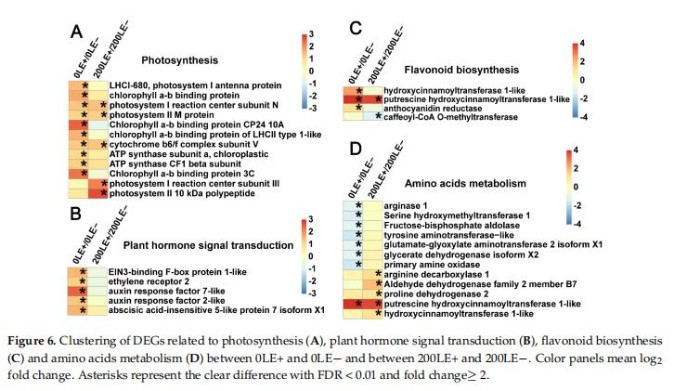E.gansuensis顯著(zhù)激活10個(gè)基因和5個(gè)光合作用基因分別為0mM和200mMNaCl濃度下。E.gansuensis的作用寄主植物的光合作用基因更明顯在0mMNaCl下比200mM氯化鈉(圖6A)。此外,E.gansuensis顯著(zhù)激活植物的五個(gè)信號傳導基因在0mMNaCl濃度下;這些基因包括乙烯信號通路的兩個(gè)基因、生長(cháng)素信號通路的兩個(gè)基因和脫落酸信號通路的一種基因。然而,E.gansuensis沒(méi)有顯著(zhù)激活植物激素信號轉導基因在200mMNaCl濃度13下(圖6B),這意味著(zhù)NaCl的影響大于E.gansuensis在植物激素基因表達方面的研究。E.gansuensis顯著(zhù)下激活植物激素信號轉導基因在0mMNaCl濃度下,但E.gansuensis在200mMNaCl濃度下顯著(zhù)調控兩個(gè)類(lèi)黃酮生物合成基因(圖6C)。E.gansuensis顯著(zhù)抑制氨基的八個(gè)基因在0mMNaCl濃度和E.gansuensis的酸代謝顯著(zhù)激活下激活植物激素信號轉導基因在200mMNaCl濃度下的(圖6D)。更遠,E.gansuensis顯著(zhù)下調甘氨酸、絲氨酸和蘇氨酸代謝,以及作為色氨酸代謝在0mMNaCl濃度下。E.gansuensis顯著(zhù)下調賴(lài)氨酸降解,上調精氨酸和脯氨酸代謝在200mMNaCl下。因此,很可能,E.gansuensis通過(guò)調節宿主氨基酸代謝來(lái)提高A.inebrians的耐鹽性。