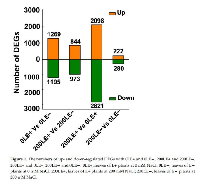進(jìn)一步闡明E.gansuensis在NaCl脅迫下對寄主植物生長(cháng)的分子機制,E+和E-A.inebrians葉片(28天齡)的轉錄組通過(guò)Illumina測序進(jìn)行分析。E+A.inebrians和E-A.inebrians用含0mMNaCl和200mMNaCl濃度處理。閾值FDR≤0.01和FC≥2用于確定DEG(差異表達基因)。結果顯示響應E.gansuensis的轉錄本發(fā)生顯著(zhù)變化,在0mMNaCl和200mMNaCl濃度下的分別發(fā)生2464和1817DEGs(圖1)。此外,在NaCl脅迫下,轉錄本發(fā)生了顯著(zhù)變化,E+葉子的4919個(gè)DEG。然而,一個(gè)小的轉錄組變化發(fā)生在對NaCl脅迫的響應,E-葉為502DEG(圖1)。