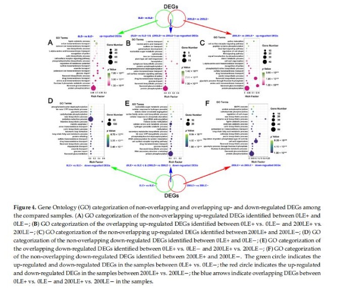 Venn結果顯示E.gansuensis僅上調1135DEG在0mMNaCl濃度下的LE+和LE-之間,E.gansuensis在200mMNaCl脅迫下僅上調LE+和LE-之間的710DEG;此外,134DEG的LE+與LE-在E.gansuensis在0mMNaCl和200mMNaCl(補充圖S4A)。同樣,E.gansuensis在0mMNaCl和E.gansuensis僅下調LE+和LE-之間的928DEG僅在A(yíng).inebrians中下調LE+和LE-之間的706DEG作為響應至200mMNaCl(補充圖S4B)。分析結果表明這些特殊的上調或下調的LE+與LE-的DEG的GO富集0mMNaCl和200mMNaCl分別顯示磷酸化信號,次生代謝物的合成和轉運,以及離子跨膜轉運A.inebrians主要富集于E.gansuensis獨特的上調DEGs在0mMNaCl濃度下(圖4A)。GO富集分析結果表明A.inebrians的“蛋白質(zhì)磷酸化”、“類(lèi)黃酮葡萄糖醛酸化”、“氨基酸跨膜轉運”、“果糖6-磷酸代謝過(guò)程”、“類(lèi)黃酮生物合成過(guò)程”和“磷酸化信號轉導”主要在200mM甘肅E.gansuensis獨特的上調DEG中富集NaCl濃度(圖4C)。細胞信號轉導通路(“蛋白磷酸化”和“細胞表面受體信號通路”)、“類(lèi)黃酮生物合成A.inebrians的“過(guò)程”、“細胞表面受體信號通路”、“葡萄糖輸入”、“陰離子跨膜轉運”和“細胞分裂”主要富集于E.gansuensis在0mMNaCl和200mMNaCl濃度下共享上調的DEG(圖4B)。E.gansuensis主要僅抑制“黃酮類(lèi)葡萄糖醛酸化”、“葡萄糖輸入”、“長(cháng)鏈脂肪酸代謝過(guò)程”、“黃酮類(lèi)生物合成過(guò)程”、“陰離子跨膜轉運”和“氧化還原過(guò)程”的A.inebrians,主要在獨特的下調DEG中富集由E.gansuensis在0mMNaCl濃度下(圖4D)?!暗鞍踪|(zhì)磷酸化”、“果糖6-磷酸代謝過(guò)程”、“黃酮類(lèi)葡萄糖醛酸化”、“通過(guò)果糖-6-磷酸進(jìn)行糖酵解過(guò)程”,“類(lèi)黃酮生物合成過(guò)程”,“調節蛋白磷酸酶2A型活性”,“鉀離子跨膜”A.inebrians的運輸”和“MAPK級聯(lián)”主要富集于獨特的甘肅大腸桿菌在200mMNaCl濃度下下調DEG(圖4F)。細胞信號轉導(“蛋白質(zhì)磷酸化”和“細胞表面受體信號通路”)、次生代謝產(chǎn)物(“類(lèi)黃酮”生物合成過(guò)程”、“絲氨酸家族氨基酸生物合成過(guò)程”和“細胞氨基酸代謝過(guò)程”)和“過(guò)氧化氫分解代謝過(guò)程”A.inebrians主要在0mMNaCl和200mMNaCl的E.gansuensis共享的下調DEG中富集(圖4E)。