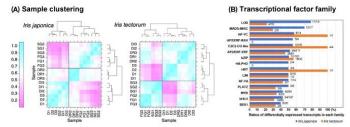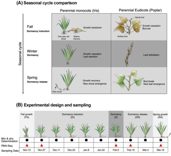 冬季休眠是植物應對潛在致命環(huán)境的最關(guān)鍵策略。近幾十年來(lái),由于氣候的變化,在經(jīng)濟上具有重要意義的多年生雙子葉植物中的這一過(guò)程得到了廣泛的研究。然而,在不需要冷卻的常綠單子葉植物中,休眠過(guò)程至今仍是一個(gè)謎。因此,揭示這些單子葉植物越冬休眠的調控機制,不僅有助于更好地開(kāi)發(fā)利用植物資源,而且對應對全球變暖帶來(lái)的低溫不足的挑戰具有重要意義。通過(guò)多年物候觀(guān)測發(fā)現,鳶尾和蝴蝶花越冬休眠過(guò)程均僅有生態(tài)休眠,將休眠植株移至適宜條件下能迅速恢復生長(cháng),且在同一栽培地區二者越冬休眠期存在明顯差異,是研究多年生單子葉植物越冬休眠機理的理想材料。本研究比較了鳶尾(I.tectorum)和蝴蝶花(I.japonica)在關(guān)鍵發(fā)育時(shí)間點(diǎn)的休眠過(guò)程。這兩種鳶尾都表現出短暫的休眠過(guò)程,且持續時(shí)間不同,在溫暖條件下都能很容易地恢復生長(cháng)。為了破譯轉錄變化,作者對鳶尾進(jìn)行了全長(cháng)測序,對蝴蝶花進(jìn)行了RNA-seq測序,分別生成參考轉錄組,揭示了調控常綠與落葉類(lèi)鳶尾越冬休眠的分子機制。