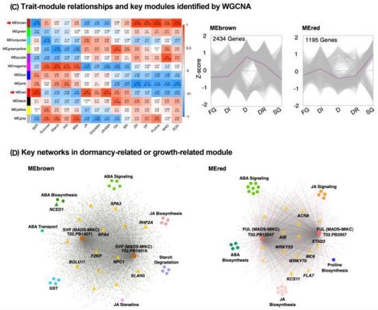 為了了解基因和通路的動(dòng)態(tài)變化,并識別鳶尾越冬性休眠過(guò)程中的休眠相關(guān)模塊,我們對IJ的所有15118個(gè)差異轉錄本進(jìn)行了WGCNA分析,共鑒定出12個(gè)共表達模塊.對每個(gè)模塊進(jìn)行了主要的表達趨勢和KEGG富集分析。并進(jìn)行模塊-形狀關(guān)聯(lián)分析,選擇形狀特異性模塊和階段特異性模塊。結果中找到分別與冬季生長(cháng)率呈顯著(zhù)正、負相關(guān)的生長(cháng)模塊(red)和休眠模塊(brown),MADS-box家族基因FUL/AP1和SVP分別位于兩個(gè)模塊,并與植物激素合成與信號轉導、碳水化合物代謝和環(huán)境響應通路基因共表達。