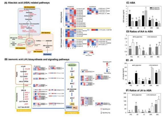 為了進(jìn)一步解剖鳶尾越冬休眠所必需的基因和通路,我們對基因表達譜和相關(guān)生理特征進(jìn)行了更詳細的研究。結果表明,脫落酸水平在D期升高了兩倍以上,并與SER呈顯著(zhù)負相關(guān),表明脫落酸在鳶尾越冬休眠中的保守作用。脫落酸生物合成和分解代謝的穩態(tài)jing q調控植物中的脫落酸水平。相比之下,IJ中參與脫落酸生物合成的差異轉錄本在DI過(guò)程中保持較低的表達水平。因此,作者推斷IJ中脫落酸水平的降低比IT中保證了更長(cháng)的營(yíng)養生長(cháng)周期。推測這可能是由于脫落酸生物合成的抑制和分解代謝的活躍所致。