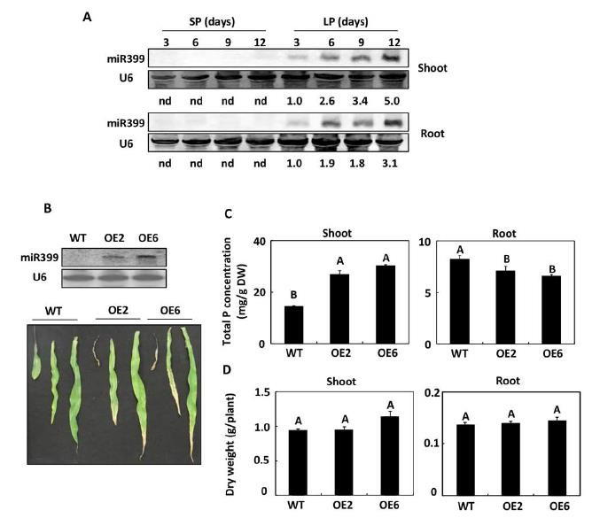圖1:MIR399b過(guò)表達轉化玉米在水培下的表型,A,smallRNAnorthernblot顯示在Pi缺乏的玉米根和地上部分的miR399是上調的;B,水培下的MIR399b過(guò)表達玉米的Pi中毒表型;C,Pi缺乏條件下,野生型和突變體玉米中根和地上部分的P濃度;D,Pi缺乏條件下,野生型和突變體的根和地上部分的干重。