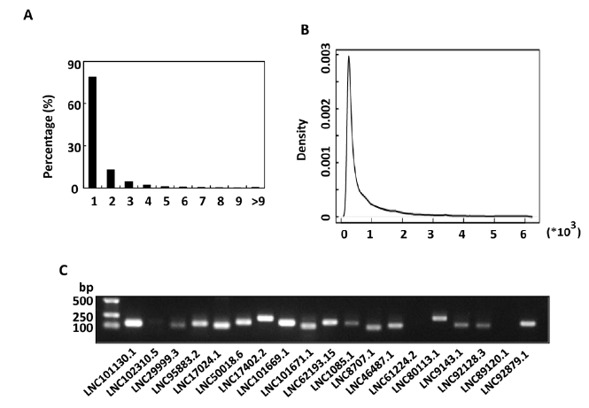 圖4:玉米lncRNAs的鑒定。A,每個(gè)lncRNA轉錄本的外顯子分布;B,lncRNA的外顯子長(cháng)度密度分布;C,RT-PCR證實(shí)隨機選擇的lncRNA