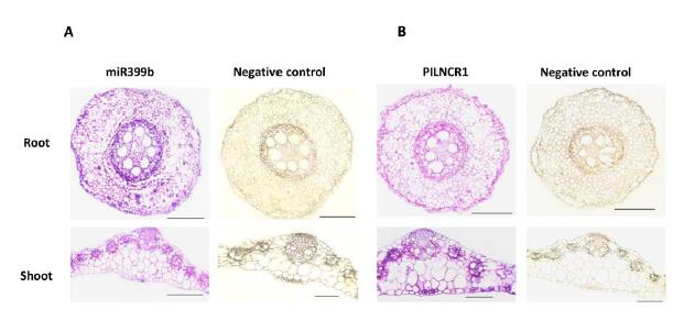為了進(jìn)一步揭示ZmmiR399b和PILNCR1之間可能的關(guān)系,我們通過(guò)原位雜交驗證ZmmiR399b和PILNCR1的表達模式。由于在磷充足條件下,ZmmiR399b和PILNCR1在玉米中的豐度比較低,于是去在pi缺乏條件下的第7天的玉米根和地上部分來(lái)驗證ZmmiR399b和PILNCR1表達模式。ZmmiR399b和PILNCR1在玉米的根和地上部分均能被檢測到,尤其是在維管束里,見(jiàn)圖6A-B。這些結果顯示ZmmiR399b和PILNCR1的空間定位至少有部分是重合的。