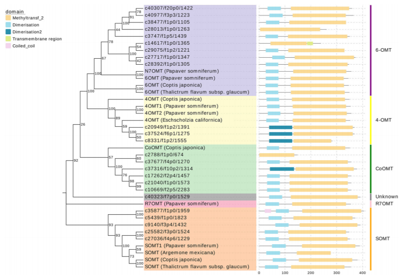進(jìn)一步研究發(fā)現,其中參與合成具有廣泛臨床鎮痛潛力的關(guān)鍵代謝物四氫巴馬汀的酶可能與唯一已知的黃連中負責催化這一步反應的ColumbamineO-methyltransferase(CoOMT)存在較大的蛋白質(zhì)序列差異。通過(guò)系統發(fā)生樹(shù)分析,作者們推斷出至少存在10種unigenes的翻譯產(chǎn)物可能催化四氫巴馬汀的合成。 特異性的氧甲基化是四氫巴馬汀與紫堇達明合成的關(guān)鍵,延胡索中是否存在特殊的一類(lèi)OMT或者具有不同底物特異性的OMT則是接下來(lái)將要重點(diǎn)解析的重點(diǎn)。