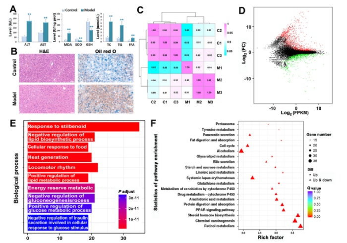 誘導小鼠發(fā)生NAFLD,結果顯示血清ALT、AST、TC、TG、FFA水平顯著(zhù)升高;MDA、SOD和GSH水平的變化表明模型組小鼠肝臟的氧化應激狀態(tài)(圖1A)。通過(guò)H&E染色和油紅O染色觀(guān)察模型組肝組織病理改變和脂質(zhì)堆積情況(圖1B)。