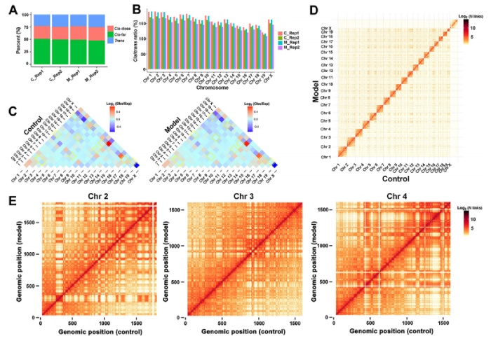 為了獲得三維染色質(zhì)構象圖,作者對肝臟樣本的Hi-C文庫進(jìn)行了測序,每組總共獲得超過(guò)477 Gb的數據。在去除PCR重復位點(diǎn)后,每個(gè)樣本獲得了超過(guò)8.02億對有效Hi-C數據,測序深度為68.56%和68.96%,能夠以10 kb分辨率檢查C組和M組的相互作用。順?lè )词较嗷プ饔玫谋壤@示,約四分之三的相互作用發(fā)生在染色體內,四分之一的相互作用發(fā)生在染色體間質(zhì)(圖2A)。,這個(gè)頻率可以揭示染色體在基因組中的相互作用強度和染色體在細胞核中的相對位置。染色體之間的相互作用頻率熱圖如圖2C所示。通過(guò)熱圖顏色由對照組的藍色變?yōu)镹AFLD組的淺紅色,可以發(fā)現染色體Chr2與Chr5之間相互作用頻率的差異,提示NAFLD組兩染色體之間距離較近,相互作用較強。相比之下,觀(guān)察到的顏色從紅色變?yōu)樗{色,表明NAFLD組染色體之間的空間距離更遠,相互作用更弱,如Chr 7和Chr 11之間的相互作用。將各組的兩個(gè)Hi-C庫結合起來(lái),進(jìn)行對照組與模型組的對比分析。根據任意兩個(gè)bin之間覆蓋的Hi-C讀對的歸一化相互作用信號強度,繪制全基因組相互作用矩陣(圖2D),染色體內相互作用矩陣如圖所示。