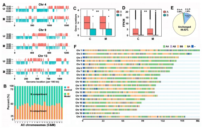 圖3通過(guò)Hi-C和RNA-seq檢測NAFLD小鼠肝臟A/B區及相關(guān)DEGs的變化。