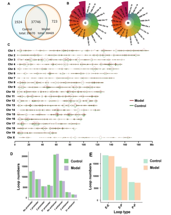 除了短程染色質(zhì)相互作用外,3D基因組組織中的遠程環(huán)帶來(lái)了兩個(gè)線(xiàn)性分離的位點(diǎn)之間的物理接近。作者通過(guò)Hi-C接觸矩陣使用改進(jìn)的HICCUP方法注釋染色質(zhì)環(huán),分辨率為10 kb。結果顯示,與NAFLD發(fā)展相關(guān)的環(huán)的總數減少(從39,670到38,469,圖5A),而環(huán)的大小沒(méi)有變化(環(huán)的中位數長(cháng)度為70 kb,支持信息圖S6A。每條染色體的環(huán)分布如圖5B和C所示,Chr 1上的環(huán)分布*多,對照組和模型組分別有3193個(gè)和3099個(gè)環(huán)(圖5B)。