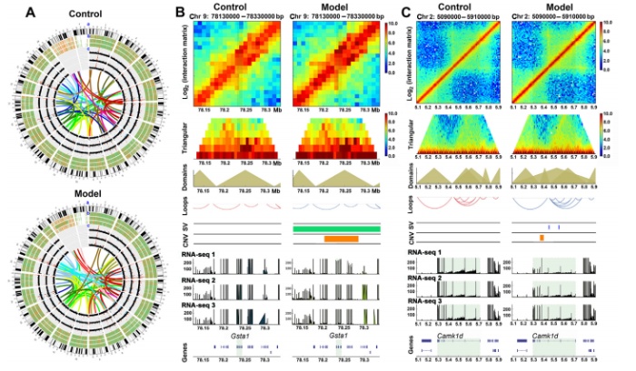 非酒精性脂肪性肝病(NAFLD)的3D基因組和基因組變異在很大程度上是未知的,盡管它們在細胞功能和生理過(guò)程中起著(zhù)關(guān)鍵作用。在正常和NAFLD小鼠的肝臟上進(jìn)行高通量染色體構象捕獲(Hi-C)、ONT測序和rna測序(RNA-seq)測定。生成高分辨率3D染色質(zhì)相互作用圖,通過(guò)Hi-C檢測不同的3D基因組層次結構,包括A/B區室、拓撲相關(guān)結構域(TADs)和染色質(zhì)環(huán),并檢測結構變異(SVs)和拷貝數變異(CNVs)的全基因組測序。在正常和NAFLD小鼠間,發(fā)現了基因組中數千個(gè)區域在3D染色質(zhì)組織和基因組重排方面的變化,并揭示了基因調節異常經(jīng)常伴隨這些變化。在NAFLD中發(fā)現了候選靶基因,受基因重排和空間組織破壞的影響。作者的數據為NAFLD研究提供了高分辨率的三維基因組相互作用資源,揭示了遺傳重排、空間組織破壞和基因調控之間的關(guān)系,并確定了與NAFLD發(fā)病機制中這些變異相關(guān)的候選基因。這些新發(fā)現為NAFLD的發(fā)病機制提供了新的見(jiàn)解,并為NAFLD的治療提供了新的概念框架。