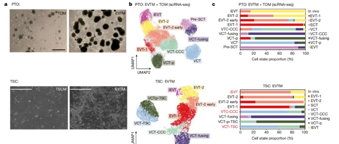 接下來(lái),作者探討了在VCT到EVT分化過(guò)程中觸發(fā)的細胞內在調控程序是否存在于源自?xún)煞N自我更新的初級滋養層類(lèi)器官(PTO)和滋養層干細胞(TSC)產(chǎn)生的EVTs中。通過(guò)對以下樣本進(jìn)行了scRNA-seq:(1)實(shí)驗組:在EVTM培養基中分化的PTO(PTO-EVTM), 對照組:在滋養層培養基(TOM)中生長(cháng)的PTO(PTO-TOM);(2)在EVTM培養基中分化的TSC(TSC-EVTM),對照組:在滋養層干細胞培養基中生長(cháng)的TSCs(TSC-TSCM)。發(fā)現: