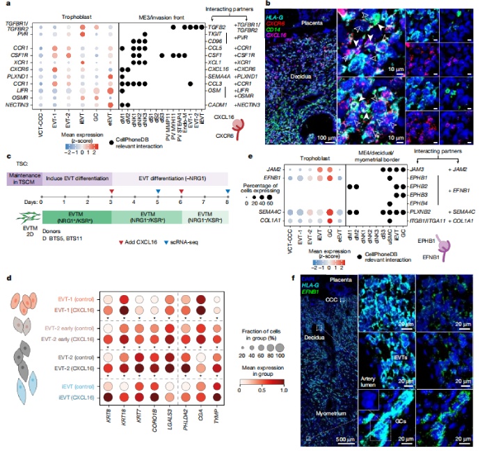 下一步作者通過(guò)scRNA-seq和snRNA-seq,以及單分子熒光原位雜交(smFISH)技術(shù),驗證了dNK通過(guò)多個(gè)配體-受體對與EVTs相互作用,且這些受體在EVT-2處表達上調。以及iEVTs通過(guò)與EFNB1結合的子宮肌層平滑肌細胞(uSMCs)特異性表達EPHB1和EPHB4從蛻膜遷移到子宮肌層;且EFNB1在iEVT和GCs中明顯上調。