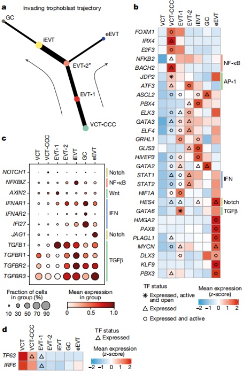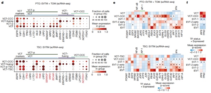 a.PTOs比TSCs更好地體現VCT的異質(zhì)性。b.在PTOs中存在體內定義的四個(gè)VCT亞群,,它們表達相同的典型標志物。c.在PTO中,VCT-CCC在EVTM存在下富集,觸發(fā) FOXM1–NOTCH1 軸 NF-κB (NFKB2和BACH2)和AP-1調制器(JDP2和ATF3),相比之下,在TSC中找不到真正的VCT。D.在TSC和PTO中,VCT-CCC(CDH5,ITGB6和LCAT1)在EVTM培養基存在下富集,從而觸發(fā)NOTCH–FOXM1軸,導致 IRF6 進(jìn)一步下調和 EVT-1 中的 TP6323。