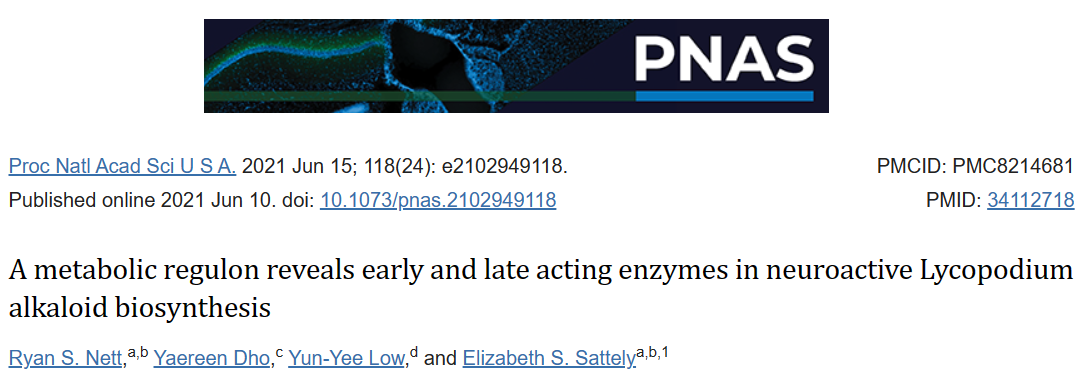 2021年6月,斯坦福大學(xué) Elizabeth S. Sattely 團隊在國際頂尖學(xué)術(shù)期刊《美國國家科學(xué)院院刊》PNAS發(fā)表一項重要研究成果,題為:A metabolic regulon reveals early and late acting enzymes in neuroactive Lycopodium alkaloid biosynthesis。研究通過(guò)代謝組學(xué)和轉錄組學(xué)的方法,確定了一組發(fā)育受控的生物合成基因,或潛在的調節子,用于調控石松生物堿的生物合成。