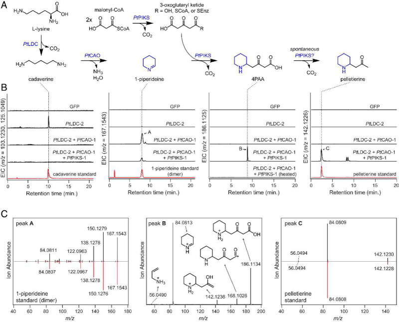 接下來(lái),推測通過(guò)向 1-哌啶聚合物中添加丙二酰輔酶 A 衍生的聚酮鏈以產(chǎn)生 4-(2-哌啶基)乙酰乙酸(4PAA),該酸可以脫羧產(chǎn)生peletierine(圖 1B)。聚酮底物的產(chǎn)生表明聚酮合酶(PKS)酶參與催化這種亞胺-酮縮合反應,并在石松生物堿的生物合成中起作用。進(jìn)一步分析揭示了兩個(gè)PKS候選基因(PtPIKS-1和PtPIKS-2),與PtLDC-1共表達基因之一(圖2C)。PtPIKS-1 PtPIKS-2與PtLDC-2 和PtCAO-1在煙草葉片中的瞬時(shí)共表達導致1-哌啶代謝物的消耗和幾種新化合物的產(chǎn)生。其中一種化合物具有與假定的石松生物堿前體peletierine相對應的精確質(zhì)量數 ([M+H]=m/z