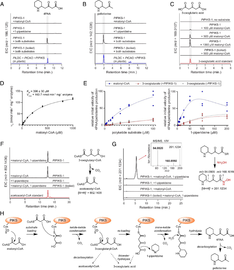 為了更好地了解這種亞胺-酮縮合的機制,獲得了兩種PtPIKS同源基因的純化蛋白用于體外分析。與我們在本式煙草中的結果一致,當添加 1-哌啶和丙二酰輔酶 A 作為底物時(shí),PtPIKS-1和PtPIKS-2在體外測定中都產(chǎn)生了4PAA和pelletierine(圖4 A和B),此外還有其他幾種未知化合物。雖然當單獨孵育 1-哌啶作為底物時(shí)沒(méi)有觀(guān)察到明顯的產(chǎn)物,但僅向PtPIKS-1添加丙二酰輔酶 A 會(huì )導致 3-氧代戊二酸的積累(圖 4 C 和 D)。3-氧代戊二酸的積累表明,PIKS能夠催化兩個(gè)丙二酰輔酶A單元縮合成硫酯連接的3-氧代谷氨?;鶊F,并且該聚酮酸從硫酯鍵上酶促或非酶水解。