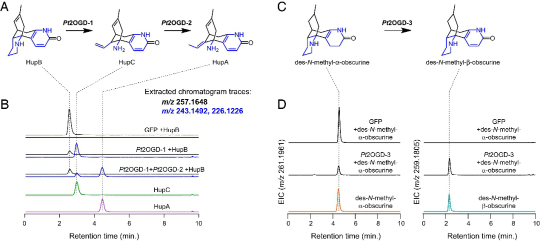 為進(jìn)一步研究其他下游生物合成途徑。特別是,兩種石松生物堿,des-N-methyl-α-obscurine(DNMAO)和des-N-methyl-β-obscurine(DNMBO),與HupB共享相同的碳骨架,可能是HupB的前體(圖 5)。因此作者通過(guò)與上述已知基因的高共表達分析及體外酶活驗證實(shí)驗發(fā)現另一種獨特的2OGD酶(Pt2OGD-3)能將DNMAO轉化為DNMBO(圖5),從而形成最終在HupA中發(fā)現的吡啶酮環(huán)。并且發(fā)現Pt2OGD-1和Pt2OGD-2可以依次作用于DNMBO,以產(chǎn)生假定的HupC和HupA的8,15-二氫同系物。Pt2OGD-1不作用 DNMAO,表明在DNMBO和HupB中發(fā)現的吡啶酮環(huán)的存在對Pt2OGD-1底物結合和/或催化活性至關(guān)重要,但是參與其中的去飽和酶尚未被發(fā)現。