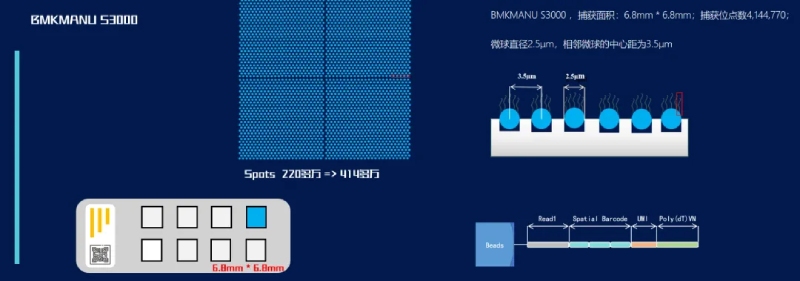發(fā)布會(huì )中,百邁客生物智能制造副總裁劉敏對百創(chuàng )S3000空間轉錄芯片的性能進(jìn)行了詳細介紹。百創(chuàng )S3000在6.8mm*6.8mm的捕獲區域內鋪設了4,144,770個(gè)捕獲位點(diǎn),相鄰兩個(gè)捕獲位點(diǎn)的中心距為3.5μm。相較于現在廣受市場(chǎng)認可與好評的百創(chuàng )S1000轉錄組芯片,捕獲位點(diǎn)數提升近2倍,分辨率同樣提升近2倍。