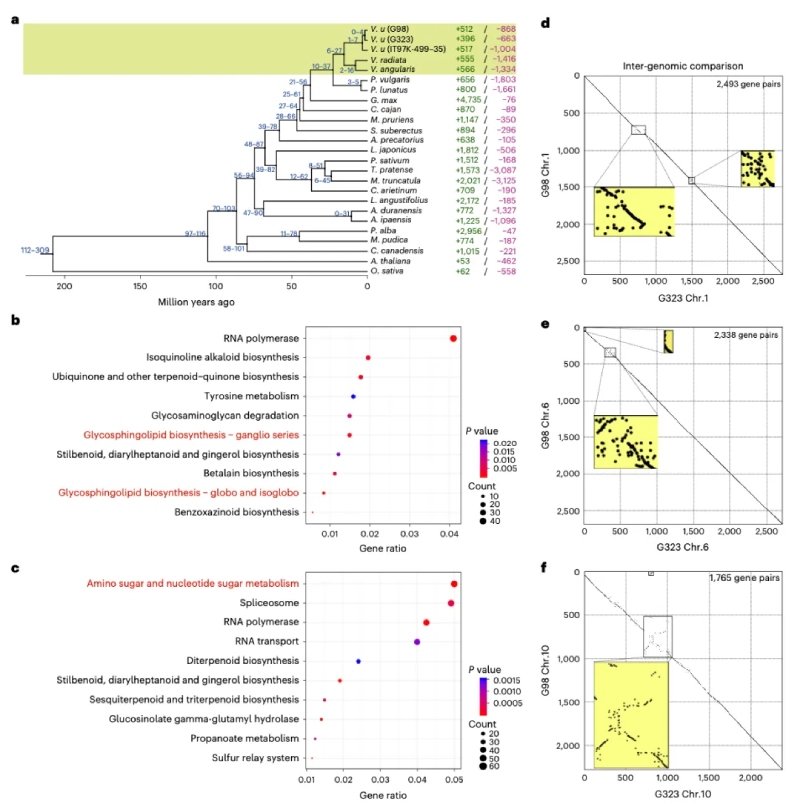 對25個(gè)物種進(jìn)行系統進(jìn)化樹(shù)分析顯示豇豆與赤小豆(V. angularis)和綠豆(V. radiata)親緣關(guān)系較近,它們的分化時(shí)間大約在6-27百萬(wàn)年前(圖2a),這與之前的報道一致?;蚣易宸治霭l(fā)現G98中有512個(gè)家族發(fā)生了顯著(zhù)擴張,這些擴張的基因家族在參與膜組織的鞘糖脂代謝途徑顯著(zhù)富集,可能與菜用豇豆的豆莢發(fā)育相關(guān)。相反,G323擴張基因在氨基酸糖和核苷酸糖代謝、硫代葡萄糖苷-谷氨酰水解酶和半乳糖代謝等能量產(chǎn)生和轉化途徑中顯著(zhù)富集(圖2b, c),這可能與糧用豇豆更高的碳水化合物積累和防御反應有關(guān)。