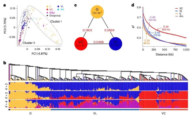 對三個(gè)亞群的核苷酸多樣性(π)和群體差異(Fst)進(jìn)行分析(圖3c)。G組(π = 0.0007)核苷酸多樣性顯著(zhù)高于VL組(π = 0.00047)和VC組(π = 0.00024)。G-VC(0.1903)和G- VL(0.0924)的FST值均高于VC-VL(0.0498)。此外,與VL和VC組相比,該組的連鎖不平衡衰減更快,表明糧用豇豆的遺傳重組程度更高(圖3d)。