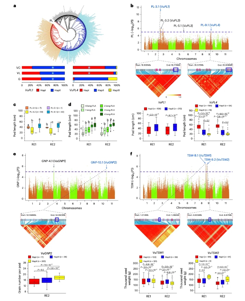 產(chǎn)量相關(guān)基因和品質(zhì)相關(guān)基因在3個(gè)亞群體(G、VL和VC)中的多態(tài)性和分布揭示了豇豆表型分化的遺傳基礎。莢長(cháng)(PL)、單莢粒數(GNP)和千粒重(TSW)是影響?hù)巩a(chǎn)量的重要因素,G亞群的PL通常比VL和VC亞群的PL短得多(圖5a)。GWAS分析挖掘到與這3個(gè)性狀相關(guān)的位點(diǎn)和候選基因,并對候選基因單倍型及其表達分析,發(fā)現PL差異可能是由于VuPL1-HapII 和 VuPL4-HapI (圖5b) 在豇豆馴化和改良過(guò)程中強烈選擇引起的。在重組自交系(RIL)群體中進(jìn)一步驗證了VuPL1和VuPL4的功能,發(fā)現VuPL1似乎比VuPL4在該群體中具有更強的作用。同時(shí)基因表達分析發(fā)現WAKs基因可能以劑量/轉錄依賴(lài)的方式導致PL差異。糧用豇豆的GNP也通常比菜用豇豆的低,可能是VuGNP2-HapIII這一有利單倍型引起的(圖5e)。TSW則可能與VuTSW1和VuTSW2基因的有利單倍型有關(guān)(圖5f),其功能也分別在RIL群體和F2群體中得到進(jìn)一步驗證。