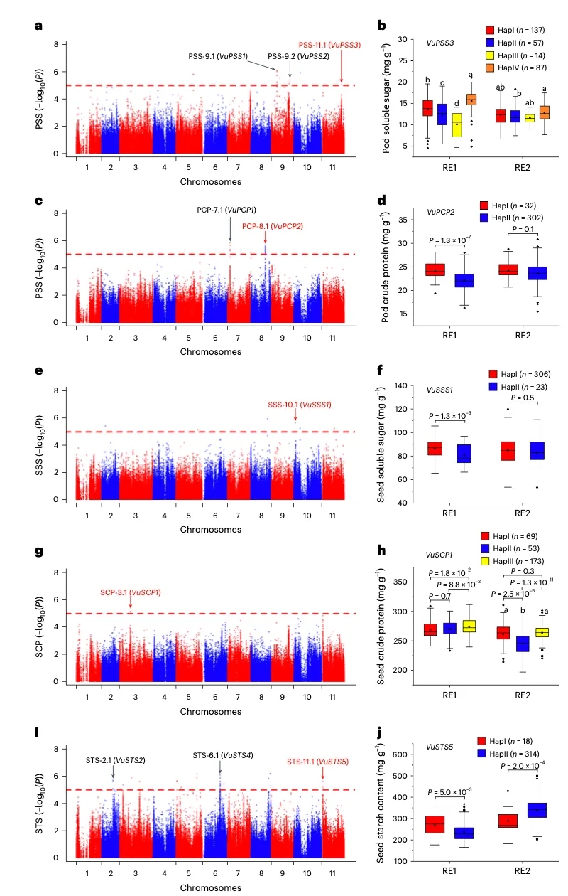 可溶性糖、總淀粉和粗蛋白質(zhì)含量是豆科作物的三個(gè)基本品質(zhì)性狀。GWAS分析檢測到三個(gè)信號與嫩莢可溶性糖含量(PSS)顯著(zhù)相關(guān)(圖6a),其中VuPSS1可能是功能相關(guān)基因,VuPSS2可能通過(guò)其順式調控元件影響PSS含量,VuPSS3-HapIV單倍型是PSS的有利單倍型。嫩莢粗蛋白含量(PCP)差異可能與有利單倍型VuPCP1-HapII和VuPCP2-HapI有關(guān)。籽??扇苄蕴牵⊿SS)含量相關(guān)的信號(圖6e)包含一個(gè)FAR1-related SEQUENCE (FAR1)家族蛋白(VuSSS1),FAR1在淀粉合成以及糖的運輸和降解中起作用,VuSSS1-HapI為其有利單倍型(圖6f)。VuSCP2-HapIII和VuSCP2-HapIV通常導致更高的籽粒粗蛋白含量(SCP),VuSCP1和VuSCP2相似的表達模式提示它們可能影響種子發(fā)育中期的SCP表型。籽??偟矸酆浚⊿TS)GWAS分析檢測到5個(gè)相關(guān)信號(圖6i),STS-2.1中的VuSTS2含有一個(gè)MYB轉錄因子,STS-11.1中的VuSTS5編碼一個(gè)磷脂酰絲氨酸脫羧酶,該酶可能影響植物發(fā)育的關(guān)鍵調節因子磷脂酰絲氨酸。兩種基因的不同單倍型在兩種環(huán)境中表現出不同的STSs,這表明它們在很大程度上受環(huán)境條件的影響(圖6j)。STS-3.1中的VuSTS3編碼了一個(gè)未知的蛋白,其中VuSTS3-HapIII對STS的影響最大。STS-6.1含有一個(gè)NAD依賴(lài)性蛋白去乙?;竀uSTS4,可能影響淀粉的生物合成和調控,而VuSTS4-HapI對STS的作用更強。以上結果有潛力成為糧用豇豆和菜用豇豆產(chǎn)量和品質(zhì)改善的遺傳資源。
