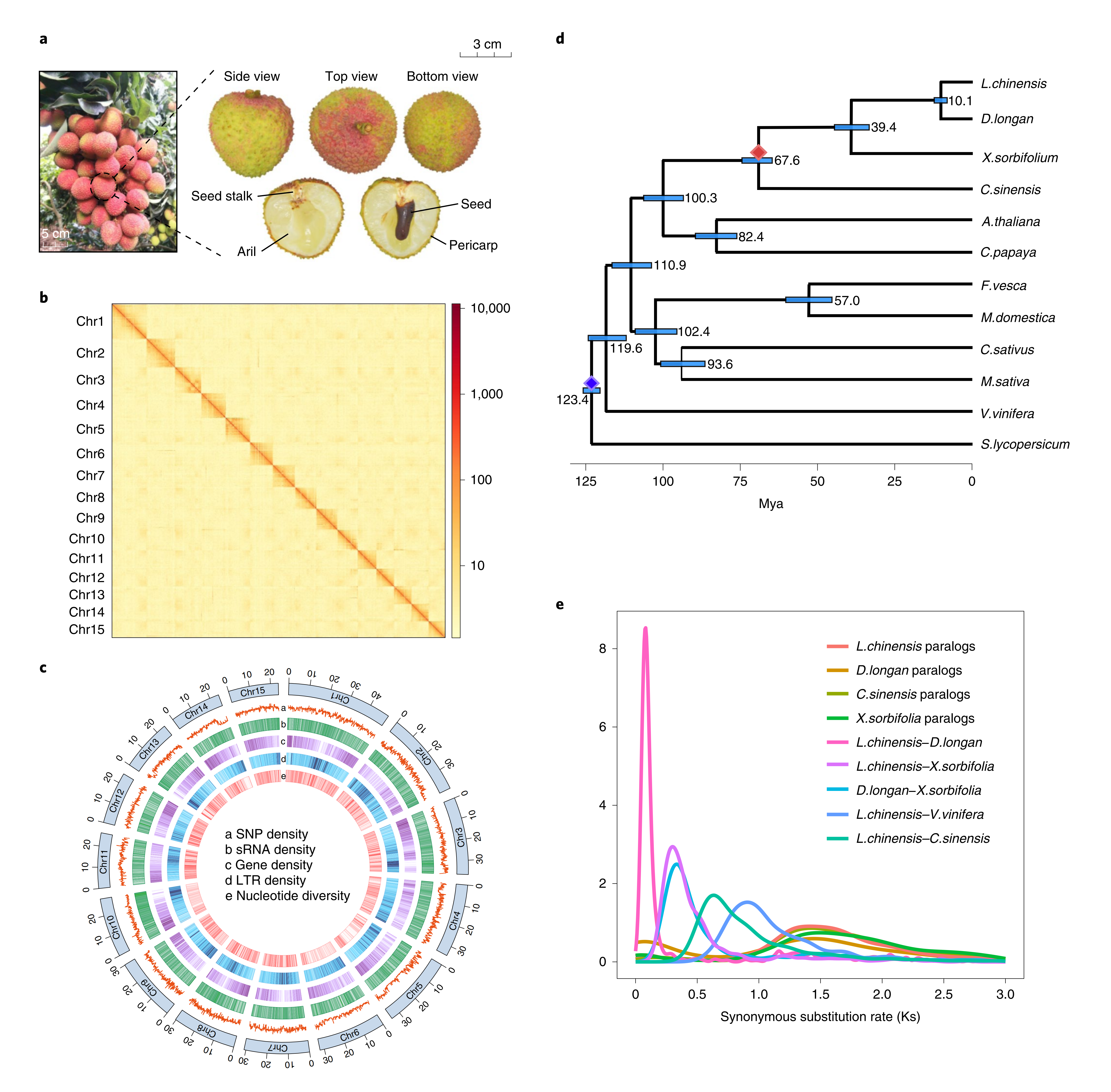 比較基因組分析表明,荔枝和龍眼-10百萬(wàn)年前(mya)從祖先物種中分離開(kāi)來(lái),而荔枝所在的無(wú)患子科與蕓香科大約在67.6mya分離開(kāi)。荔枝、龍眼、文冠果和甜橙自共享y三倍化事件后并無(wú)獨立的WGD事件。