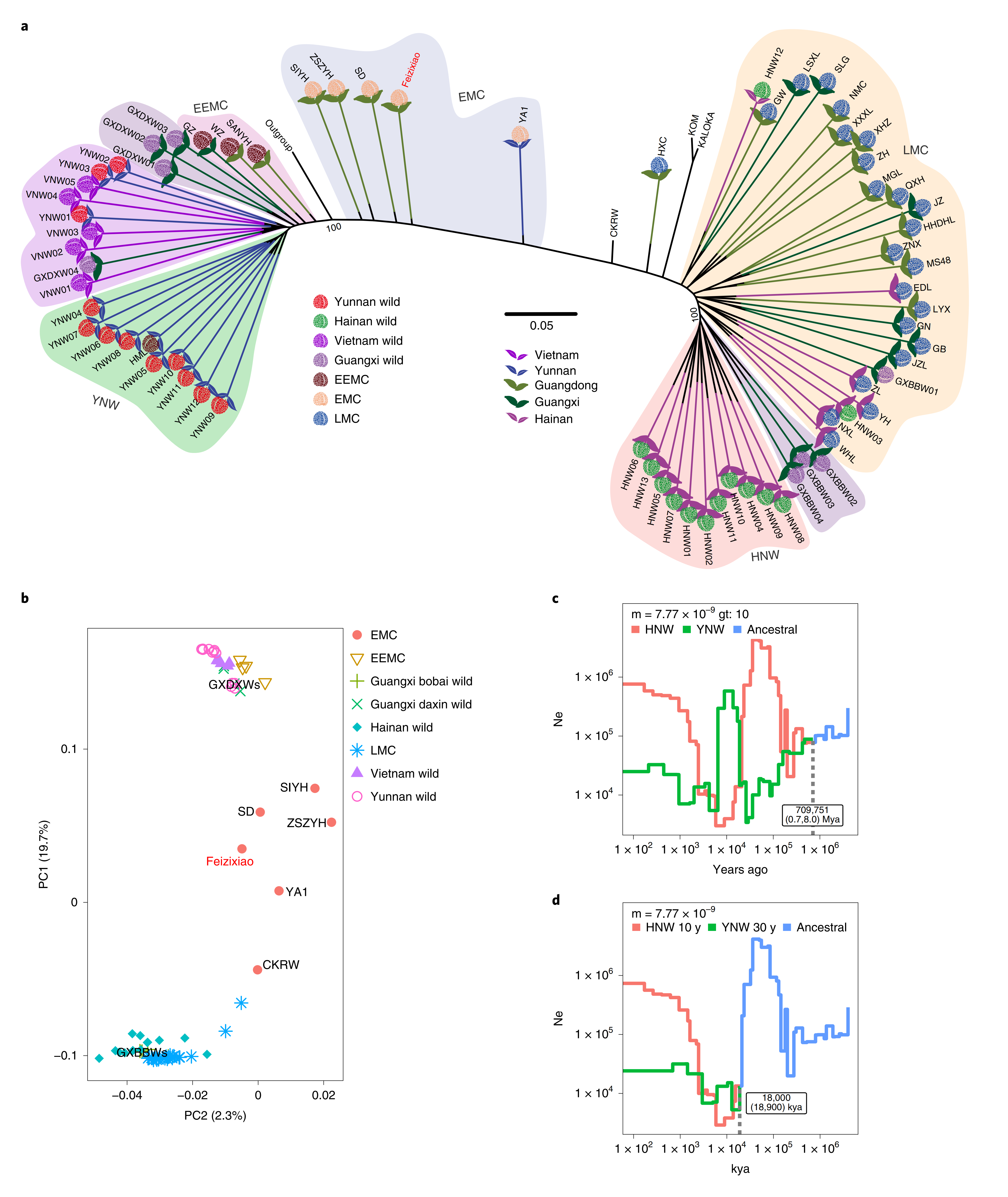 利用通過(guò)對72份荔枝進(jìn)行重測序分析,發(fā)現荔枝大致可分為3個(gè)群體,即云南極早熟品種(EEMC/YNW)、海南晚熟品種(LMCHNW)、早熟栽培種(EMC)。其中值得注意的是,大新野生和博白野生荔枝雖然都位于廣西,但兩者間卻存在明顯的遺傳差異。分析發(fā)現云南野生種群經(jīng)歷了強烈的馴化瓶頸。