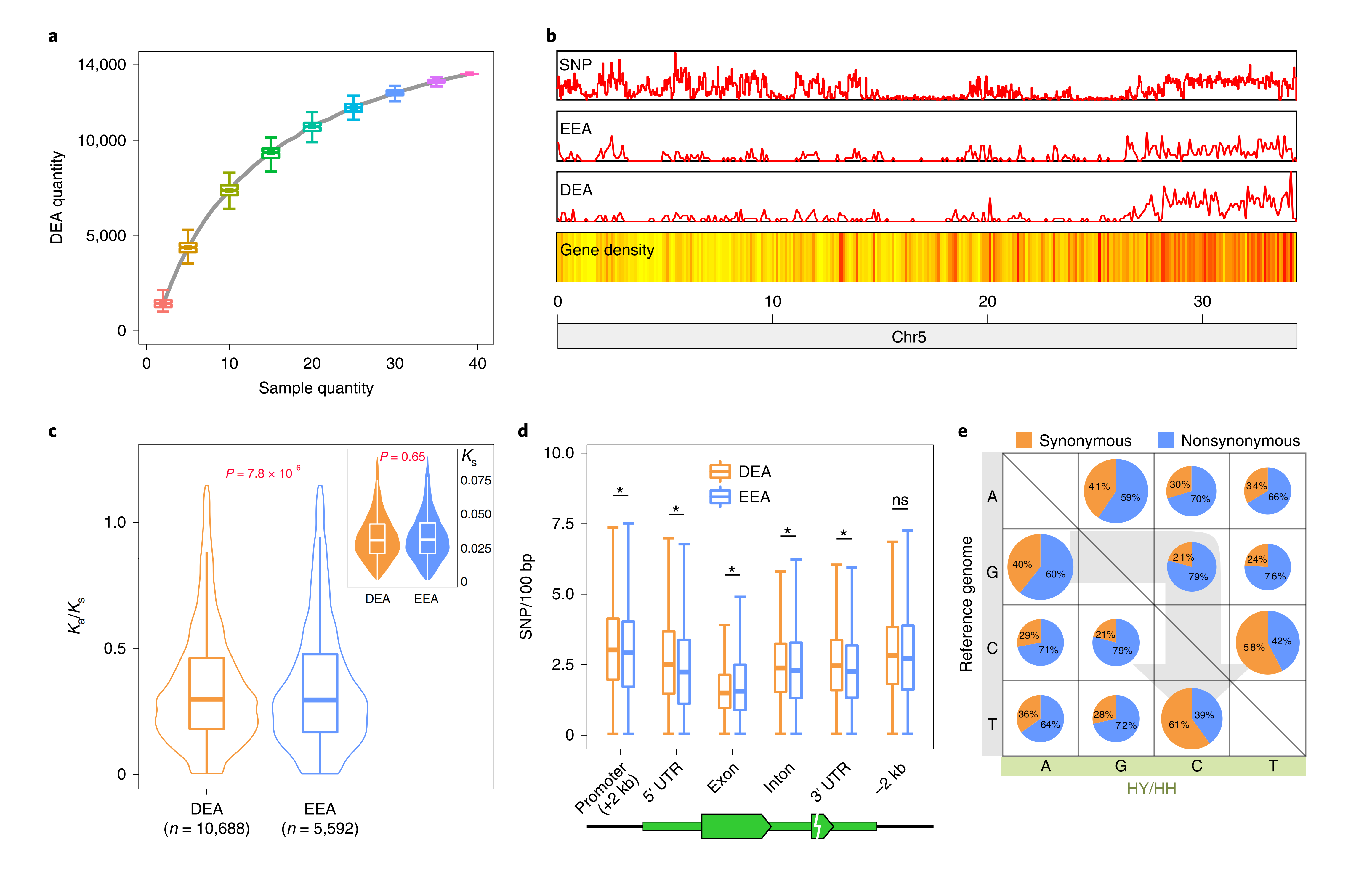 作者通過(guò)SNP分型和單細胞10x?Gemomics測序,利用“妃子笑”荔枝的高雜合性(2.27%),成功獲得的兩個(gè)單倍型的基因組(云南單倍型,HY;海南單倍型,HH)。對39個(gè)妃子笑”不同組織和時(shí)期樣本進(jìn)行轉錄組測序分析,共鑒定到13517個(gè)等位差異表達基因(DEA)。DEA在基因組上的分布并不是均勻的,在某些區域具有集中現象,可能與特定的生物學(xué)過(guò)程相關(guān)。還發(fā)現,DEA和等位等量表達基因(EEA)具有相同的Ks值,但是DEA經(jīng)受更強的選擇壓力。