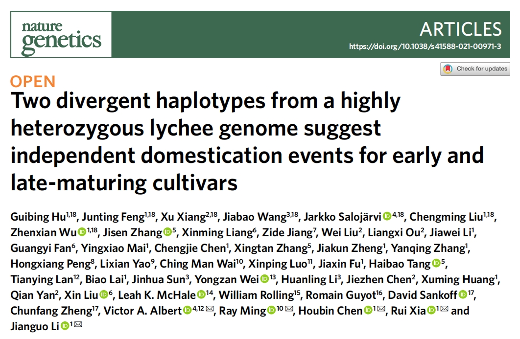 基于荔枝(Litchi chinensis)基因組的高度雜合(~2.27%),構建了兩套高質(zhì)量妃子笑”單倍型基因組(470 Mb)。72份荔枝重測序分析發(fā)現,來(lái)自云南的一個(gè)野生群體的極早熟荔枝品種主要與“妃子笑”的其中一個(gè)單倍型對應;來(lái)自海南的一個(gè)野生群體的晚熟荔枝品種則與另外一個(gè)單倍型對應。早熟荔枝品種可能是極早熟荔枝品種與晚熟荔枝品種的雜交形成的,在廣東培育而成。包含一對CO-likc基因的3.7kb序列的缺失變異可能調控著(zhù)不同荔枝品種間的果實(shí)成熟差異。