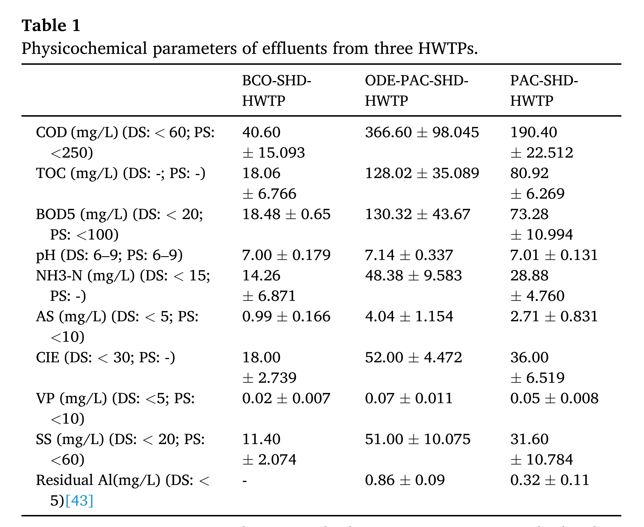 該研究共同評估了九種常見(jiàn)的理化指標,這些指標在三個(gè)污水處理廠(chǎng)的出水點(diǎn)表現出明顯的梯度分布。在這些指標上,ODE-PAC-HWTP 超過(guò)了 PAC-HWTP,PAC-HWTP 超過(guò)了 BCO-HWTP。BCO-HWTP出水中COD、BOD5、pH、NH3-N、AS、Color、VP、SS等濃度基本符合國家排放標準。PAC-HWTP 出水的 COD、BOD5、pH、NH3-N、AS、顏色、VP 和 SS 水平通常符合國家預處理標準,允許排放到通向市政污水處理廠(chǎng)的下水道中。相反,ODE-PAC-HWTP出水中COD和BOD5的濃度超過(guò)國家預處理標準。此外,還對兩個(gè)經(jīng) PAC 處理的 HWTP 出水中的殘留鋁濃度進(jìn)行了測試。在 ODE-PAC-HWTP 和 PAC-HWTP 的出水中,檢測到的殘留 Al 濃度分別為 0.86 ± 0.09 mg/L 和 0.32 ± 0.11 mg/L。這些值符合 2002 年環(huán)境保護法制定的鋁廢水排放標準,該標準規定限值為 5.0 mg/L 。