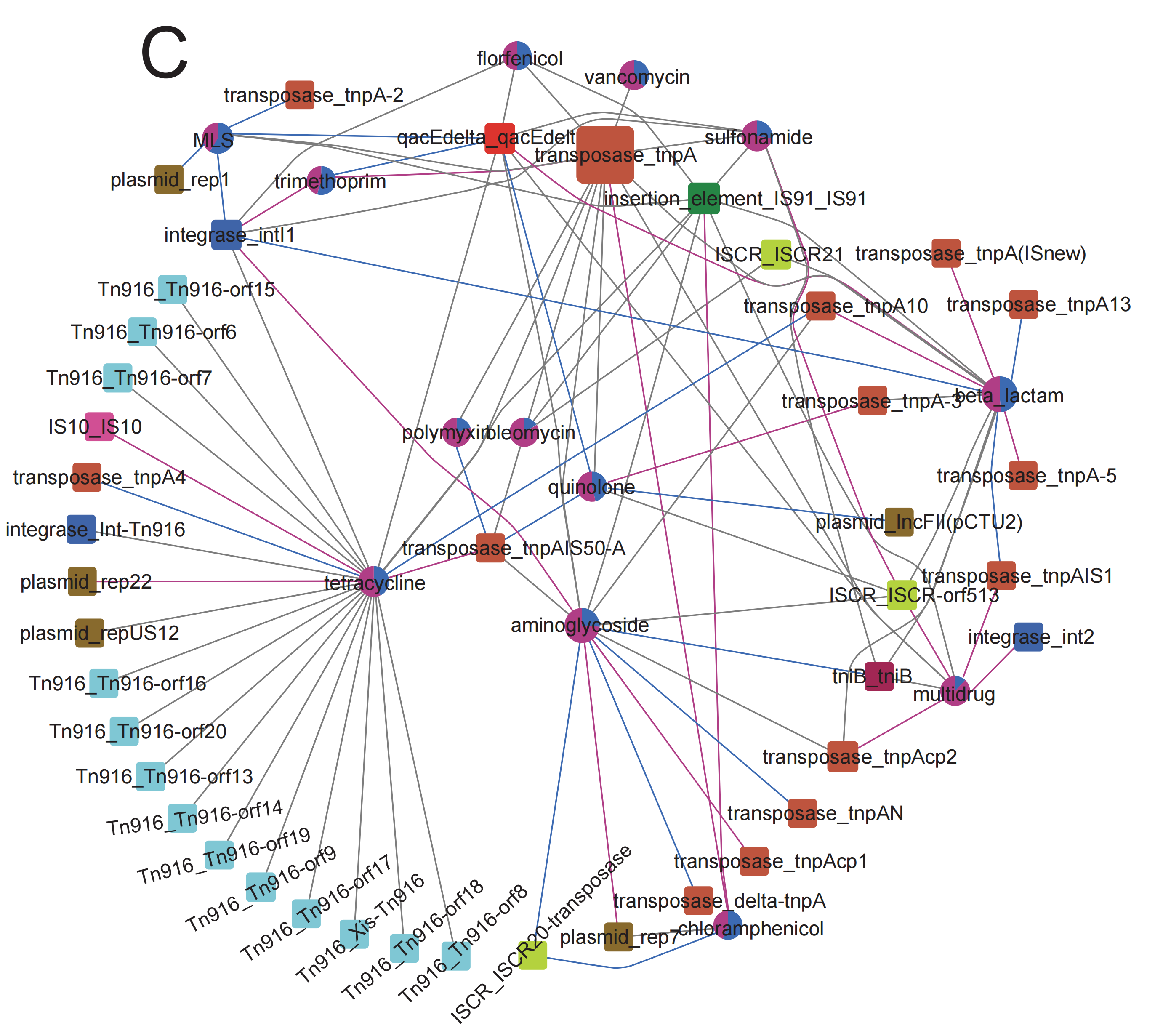 圖3-(A)Procrstes分析和Mantel檢驗。(B)三個(gè)熱泵的進(jìn)水和出水中與MRG共存的ARG的相對豐度的差異。(C)顯示MRG和ARG類(lèi)型同時(shí)出現的網(wǎng)絡(luò )圖。