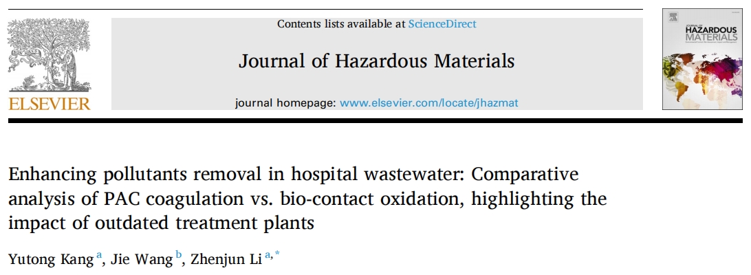 Kang Y, Wang J, Li Z. Enhancing pollutants removal in hospital wastewater: Comparative analysis of PAC coagulation vs. bio-contact oxidation, highlighting the impact of outdated treatment plants.?J Hazard Mater. Published online April 17, 2024. doi:10.1016/j.jhazmat.2024.134340