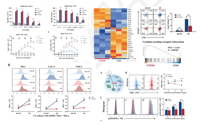 關(guān)于CAR-T細胞中TGF-β信號通路的調控作用,作者結合流式細胞檢測結果發(fā)現,與傳統的CART細胞在暴露于增加濃度的rhTGF-β1時(shí)TβRI顯著(zhù)上調不同,共同表達SMAD7的細胞在rhTGF-β1處理后TβRI(TGF-β受體)水平是下降的,RNA-seq和qPCR檢測表明,在HER2+腫瘤細胞刺激后,與對照組CAR-T細胞相比,共表達SMAD7的CAR-T細胞中細胞因子的產(chǎn)生顯著(zhù)減少,即SMAD7阻礙了CAR-T細胞中細胞因子的合成。