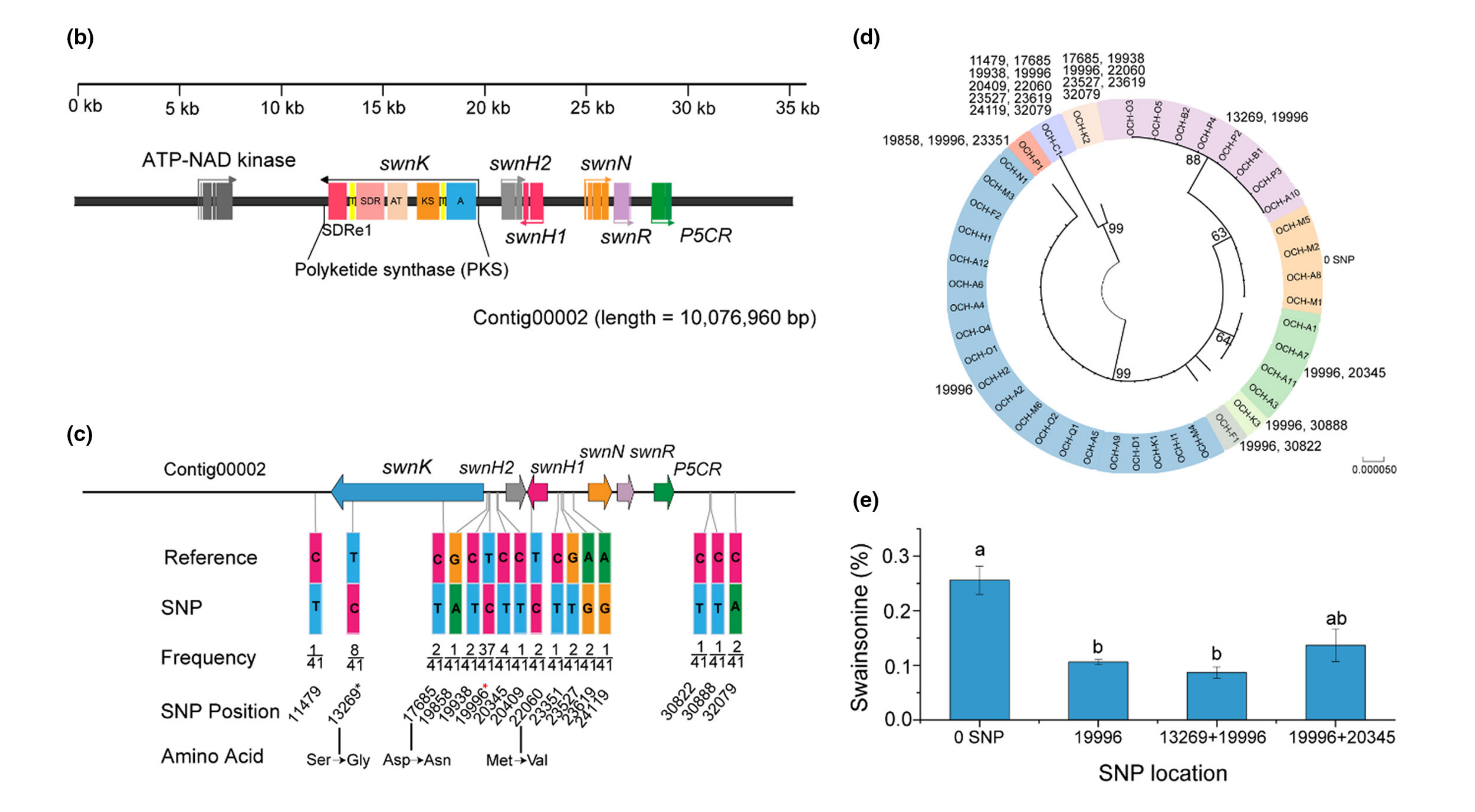 該研究豐富了前期推測的SW合成通路,進(jìn)一步分析顯示,一個(gè)編碼P5CR的基因位于SWN簇上,也包含在SWN的全長(cháng)序列中。對從中國3個(gè)省13個(gè)地理位置采集的黃花棘豆種分離的41株A.oxytropis的重測序分析顯示,一個(gè)位點(diǎn)SNP19996與SW含量相關(guān)。