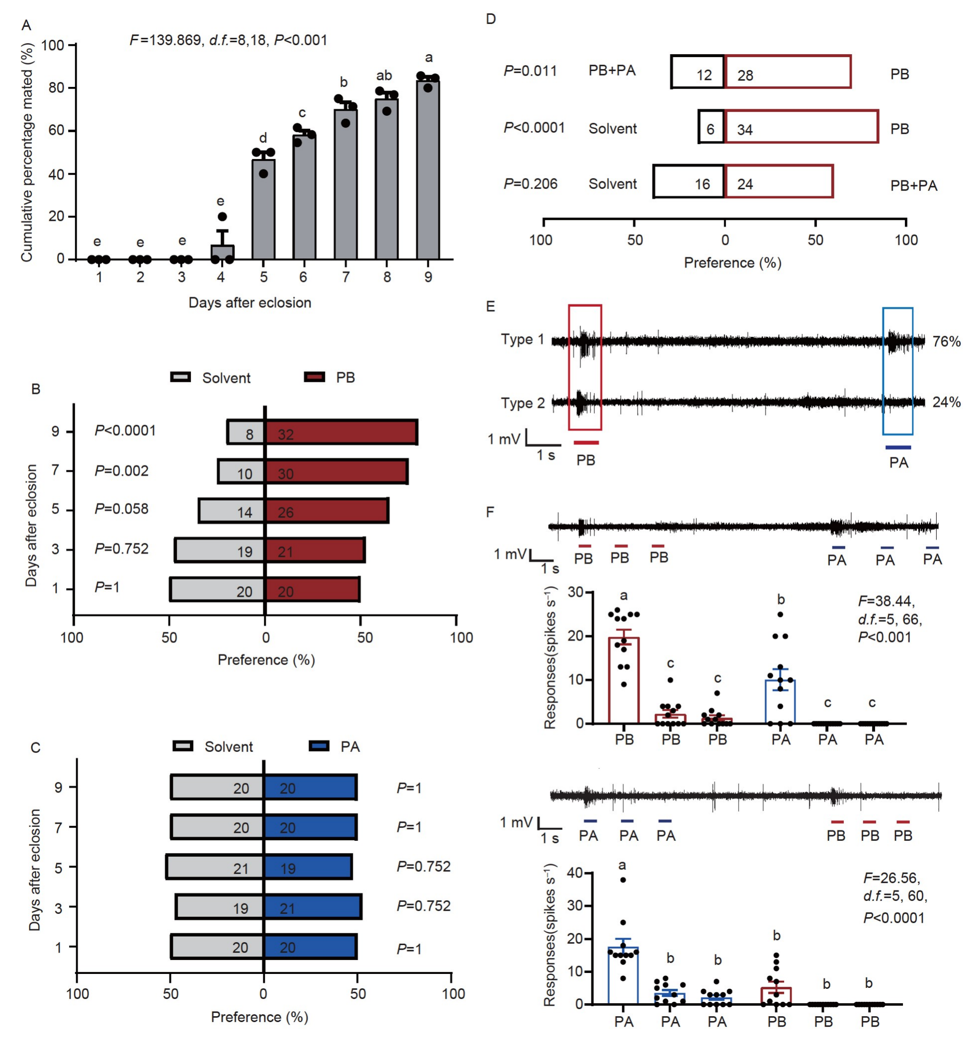 研究團隊使用Y型管嗅覺(jué)儀對不同日齡的雄蟲(chóng)進(jìn)行了行為學(xué)測試,以觀(guān)察它們對PB和PA的反應。此外,通過(guò)視頻記錄和分析,評估了雄蟲(chóng)的交配行為。交配率在5 DAE時(shí)增加到近50%,6 DAE時(shí)增加到60%以上,此后緩慢而穩定地積累(圖1A)。雄蟲(chóng)對PB和PA的偏好測試結果反應,PB是主要的性信息素成分,能夠顯著(zhù)吸引雄蟲(chóng)。而PA雖然單獨存在時(shí)不吸引雄蟲(chóng),但其存在能夠減弱PB的吸引作用(圖1B-D),表明PA可能在調節性行為中起到平衡作用。