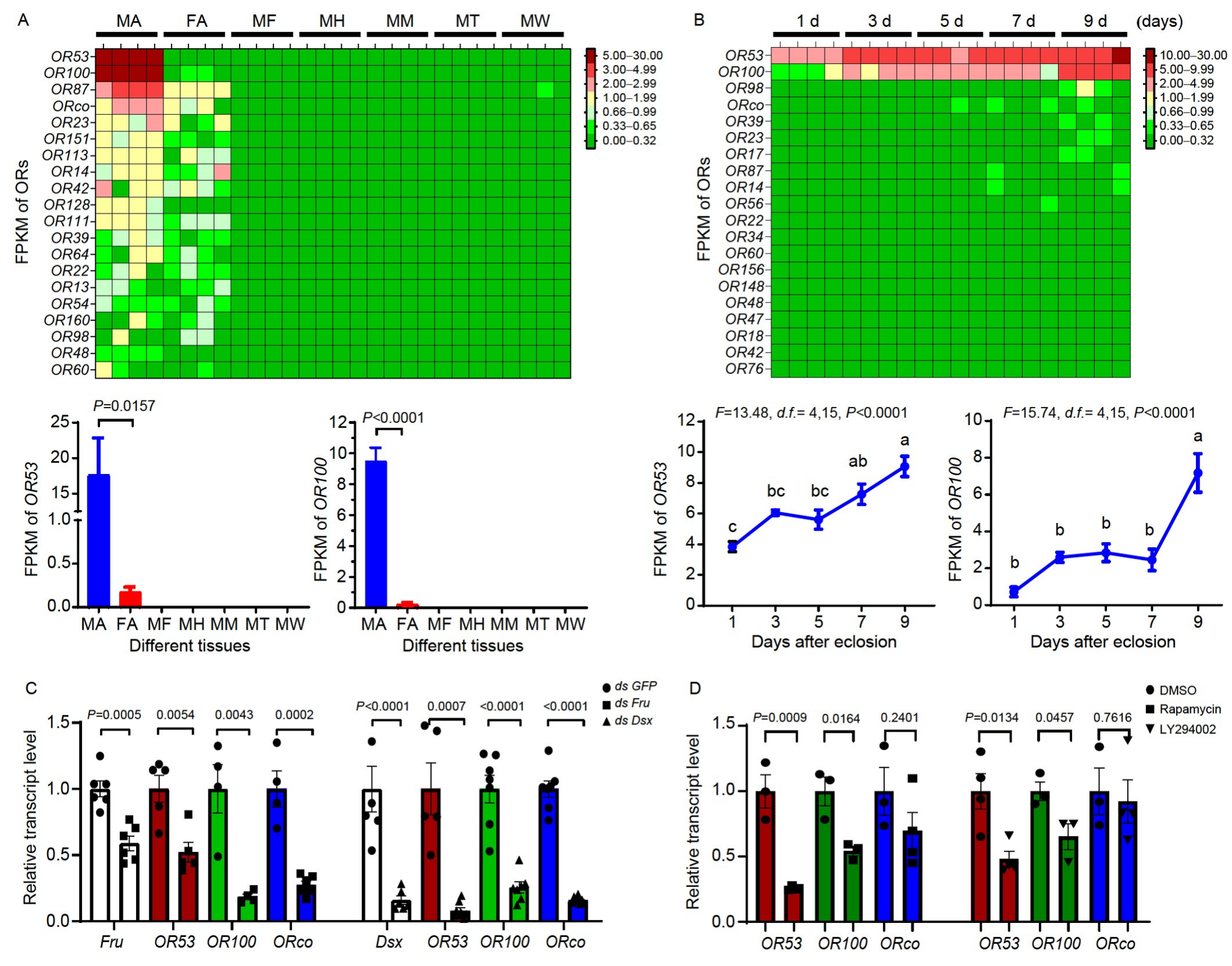 研究人員利用Bulk RNA測序技術(shù)分析了雄蟲(chóng)不同組織中嗅覺(jué)受體基因的表達情況,并通過(guò)果蠅遺傳學(xué)方法,將美洲大蠊的嗅覺(jué)受體基因在果蠅中表達,以鑒定PA和PB的受體。通過(guò)RNA測序分析得到的嗅覺(jué)受體基因在不同組織(雄蟲(chóng)觸角-MA、雌蟲(chóng)觸角-FA、雄蟲(chóng)前足-MF、雄蟲(chóng)頭部-MH、雄蟲(chóng)口器-MM、雄蟲(chóng)精巢-MT和雄蟲(chóng)翅-MW)和不同日齡中的表達水平(圖2A、2B),以及通過(guò)qPCR驗證的OR53、OR100和ORco基因在雄蟲(chóng)觸角中敲除fru或dsx基因后的表達水平(圖2C),以及經(jīng)過(guò)營(yíng)養信號通路抑制劑處理后的表達水平變化(圖2D)。研究鑒定出OR53和OR100為PA/PB和PA的受體,并發(fā)現它們在雄蟲(chóng)觸角中的表達模式與行為測定結果相吻合,證實(shí)了這兩種受體在性信息素感知中的關(guān)鍵作用。