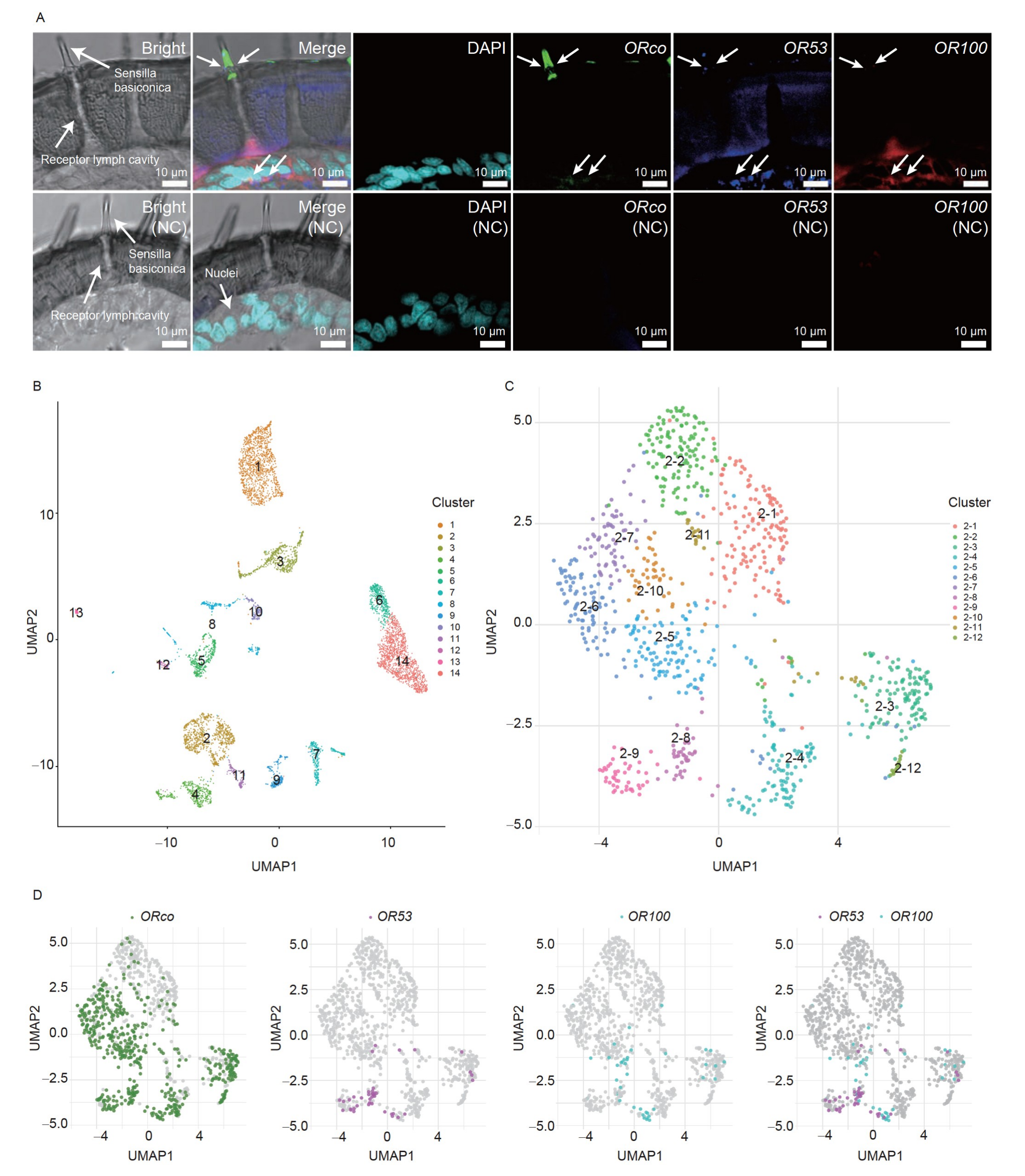 研究人員利用FISH技術(shù),觀(guān)察到OR53、OR100和ORco經(jīng)常在同一個(gè)感受器中表達,說(shuō)明大多數基本感受器同時(shí)含有OR53和OR100的ORN。為了更系統地研究OR基因的表達,研究人員使用性成熟雄蟲(chóng)的觸角進(jìn)行了單細胞測序。測定每簇細胞的基因表達水平,鑒定出Cluster 2為ORco高表達的ORN(圖4B)。進(jìn)一步分析Cluster 2細胞得到12個(gè)亞型(圖4C)。其中大部分感受器同時(shí)具有OR53和OR100兩種OR53 ORNs,而少數感受器僅具有OR53?ORNs。12個(gè)亞型中有4個(gè)同時(shí)表達OR53和OR100,可能對應于主要的1-型感受器的ORNs。在2-亞型中,還發(fā)現了OR53的顯著(zhù)表達亞型,可能對應2型感受器的ORNs,也可能只有少量的感受器OR100?ORNs(圖4D)。這些結果進(jìn)一步支持了性成熟雄蟲(chóng)觸角中至少存在兩種錐形感受器。