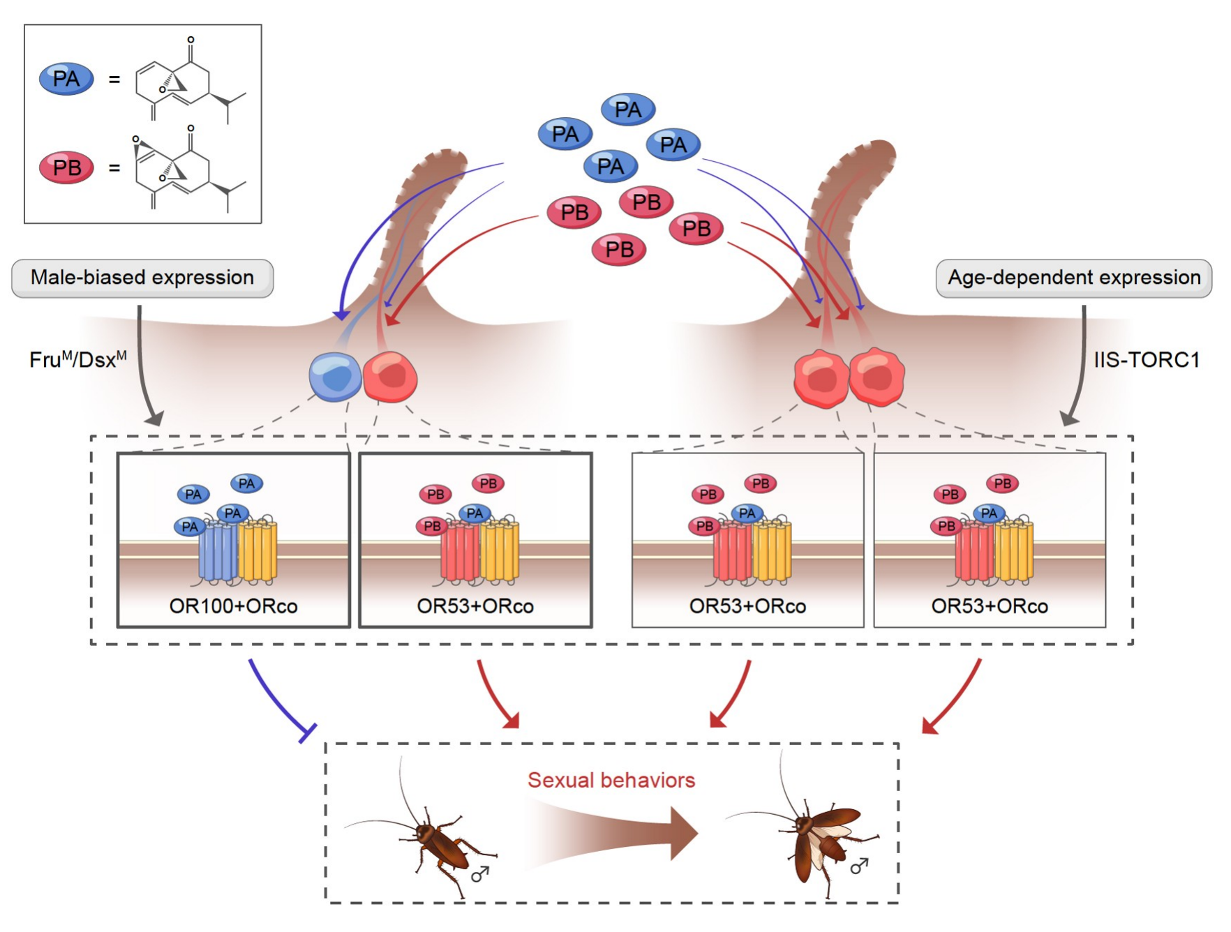 研究結果表明,PB作為主要的性信息素成分,通過(guò)激活OR53受體來(lái)誘導雄蟲(chóng)的求偶交配行為。而PA雖然單獨存在時(shí)不吸引雄蟲(chóng),但其存在能夠通過(guò)兩種可能的途徑減弱PB的吸引作用:一是PA與PB競爭激活相同的受體OR53,二是PA通過(guò)激活其特定的受體OR100來(lái)抑制性行為。該研究確定了兩種性信息素嗅覺(jué)受體以及可能調控雄蟲(chóng)特異性和年齡依賴(lài)性求偶交配行為的分子機制,有助于發(fā)展綠色防蟑技術(shù)及害蟲(chóng)綜合管理策略。