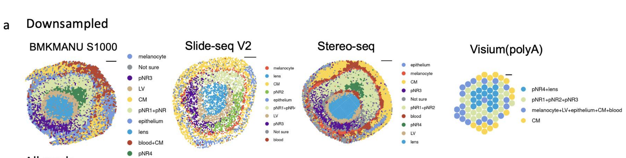 通過(guò)對各種技術(shù)平臺小鼠胚胎眼球數據的聚類(lèi)注釋并與經(jīng)典結構做對比,進(jìn)行了評估測試,在全部數據下Slide-seqV2,Stereo-seq表現出了預期結果,BMKMANU S1000?在黑色素細胞的分型中未能預期,這也跟之前的分子橫向擴散結果相匹配。同時(shí)在歸一化的數據下,BMKMANU S1000與其它兩種技術(shù)有了相似的細胞類(lèi)型檢出,這樣證明測序的數據量也會(huì )對后續的細胞類(lèi)型鑒定造成影響。