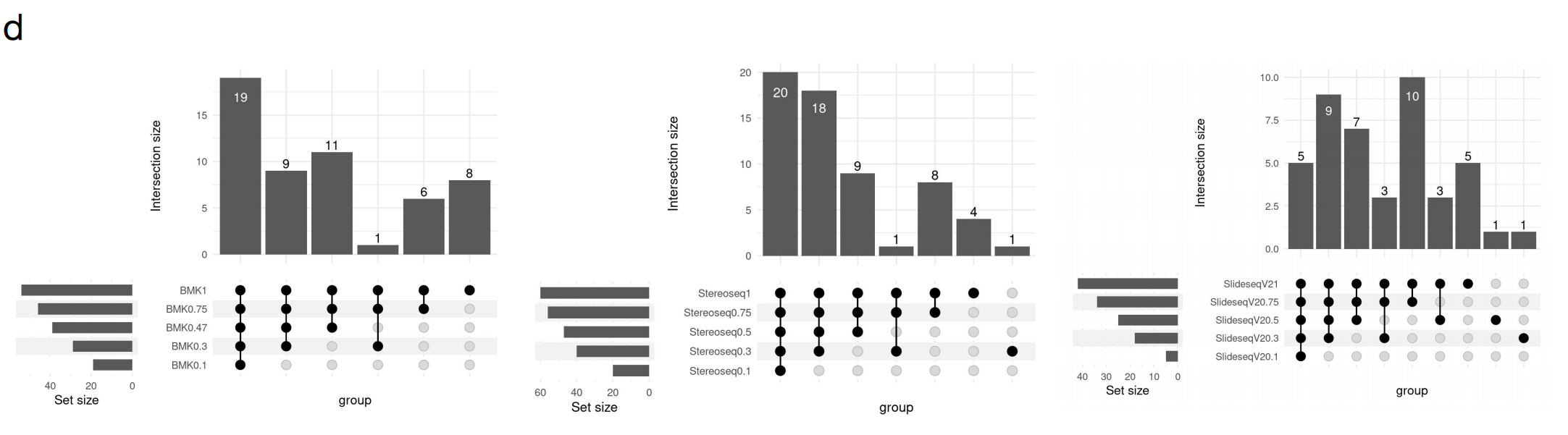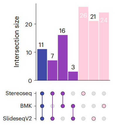 文中對visium(polyA-based)未能捕獲到的基因,在其它技術(shù)平臺中的表現也做了統計,其中BMKMANU S1000、Stereo-seq及Slide-seqV2都展現出了統一且全面的基因捕獲性能。