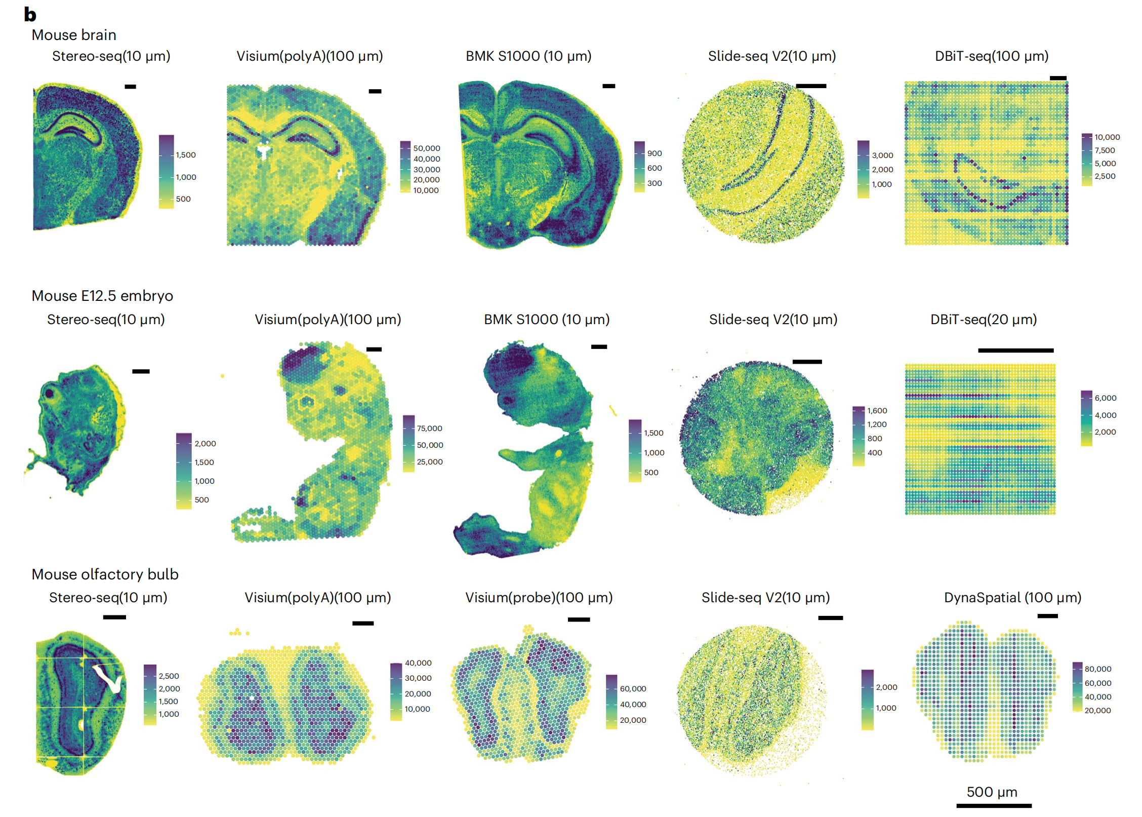 使用11種sST技術(shù),對三種組織進(jìn)行實(shí)驗,測序及分析,并對可以實(shí)現更高分辨率的BMKMANU S1000、Stereo-seq及Slide-seqV2?在細胞級(10μm)分辨率下進(jìn)一步進(jìn)行了分析。
