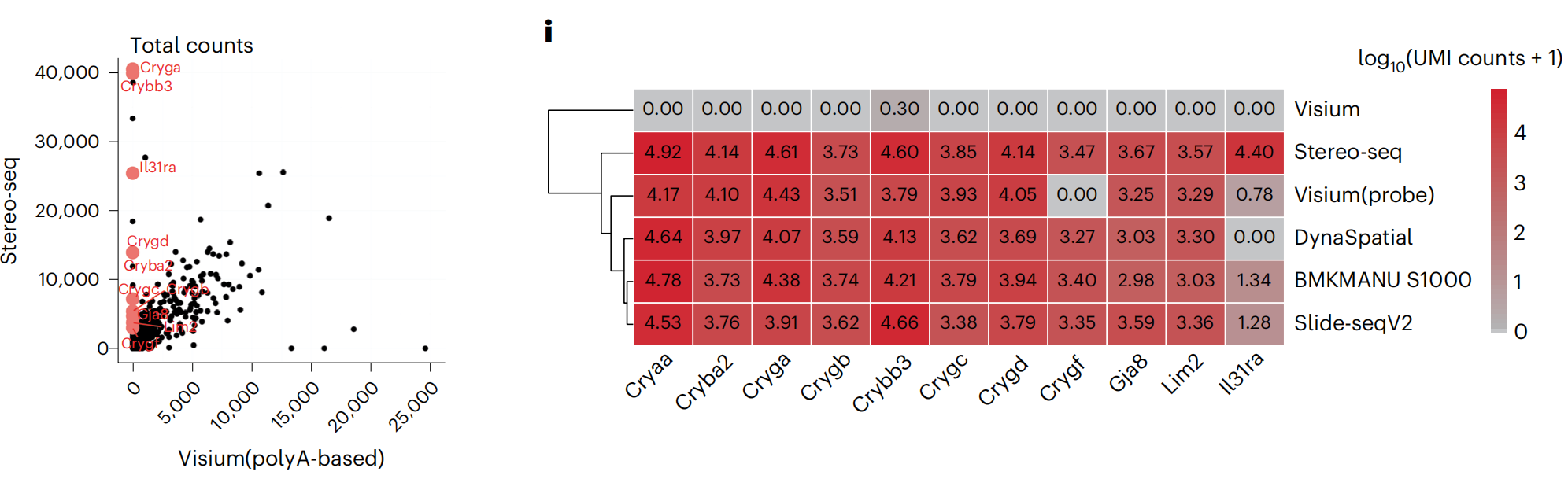 在各個(gè)平臺的捕獲性能測試中,文章通過(guò)對相同捕獲面積內的UMI數進(jìn)行統計,以此來(lái)進(jìn)行捕獲效率的評判,文中分別對原始測序下,以及數據歸一化條件下,進(jìn)行了統計,展示出了較大的差異,這意味著(zhù)不同的測序量對UMI的檢出存在較大的影響,高的數據量可以明顯提升UMI的檢出,隱性表示空間組學(xué)應需要比單細胞更高的測序深度。
