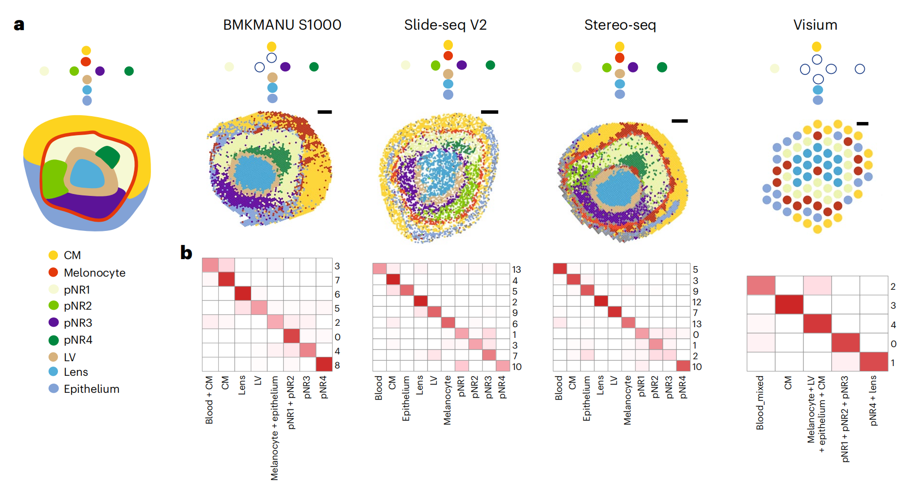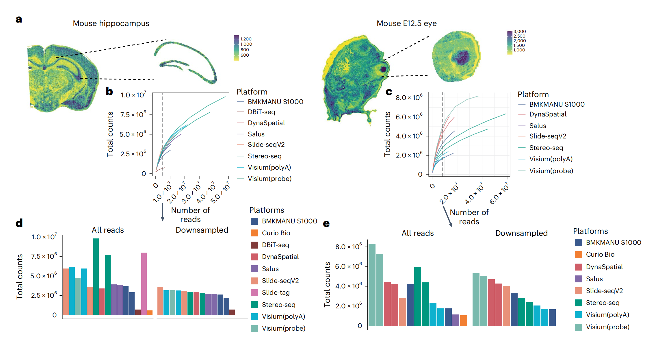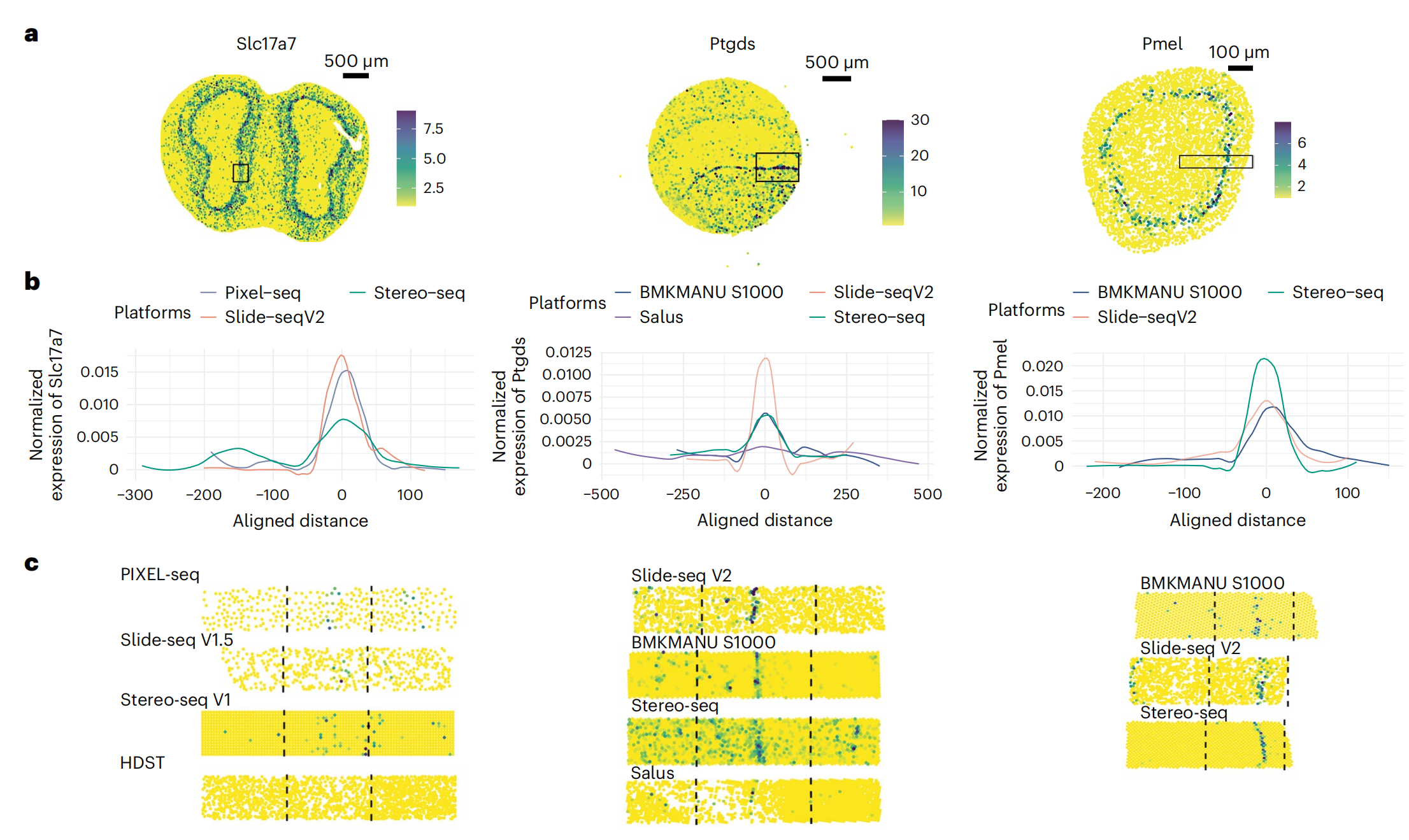 通過(guò)小鼠嗅球(Pixel-seq,Stereo-seq,Slide-seqV2),小鼠腦海馬(BMKMANU S1000,Slide-seqV2,Salus,Stereo-seq),小鼠胚胎眼球(BMKMANU S1000,Stero-seq,Slide-seqV2)經(jīng)典marker(Slc17a7、Ptgds及Pmel)的回溯來(lái)評估分子的橫向逸散問(wèn)題,發(fā)現BMKMANU?S1000在腦海馬的表現優(yōu)秀,在小鼠胚胎眼球中表現不足,不同的技術(shù)表現出的差異,文中也給出了推論:可能跟樣本切片操作及組織透化等實(shí)驗存在關(guān)聯(lián),提示后續的研究者在樣本準備及透化實(shí)驗應該更加的謹慎。
