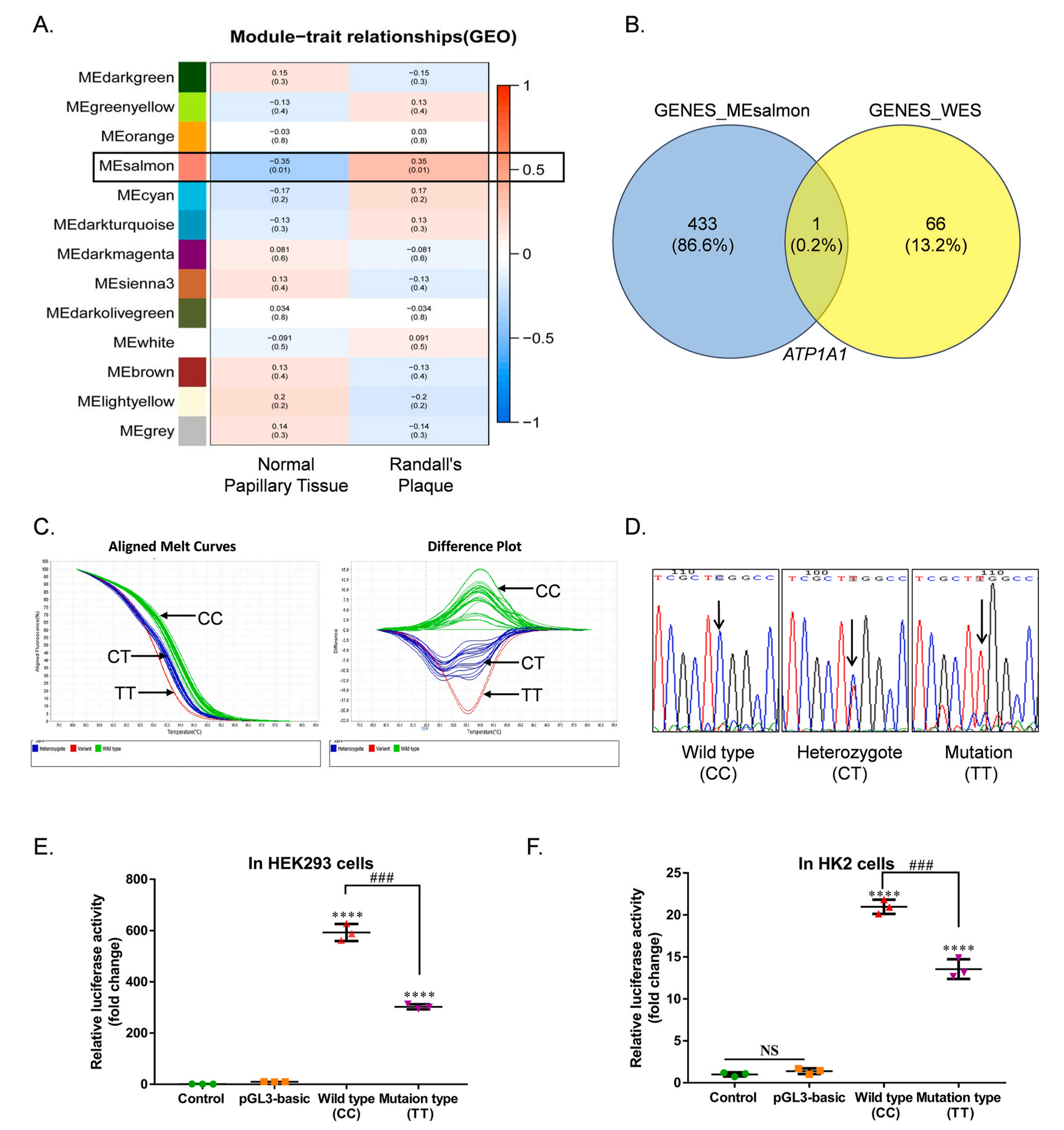為進(jìn)一步探究腎結石相關(guān)關(guān)鍵基因,該研究對28例中國漢族CaOx結石患者進(jìn)行了WES分析,共鑒定得到76個(gè)SNPs,其中錯義SNPs31個(gè),編碼同義SNPs30個(gè),3′UTR7個(gè)SNPs,5′UTR區8個(gè)SNPs,作為候選SNPs,這些突變位點(diǎn)定位于67個(gè)基因,將這67個(gè)基因與WGCNA分析中的434個(gè)基因做韋恩圖取交集,發(fā)現ATP1A1是兩個(gè)數據集交叉點(diǎn)中的唯一基因,一定程度上說(shuō)明了ATP1A1在鈣結石形成中的潛在作用。