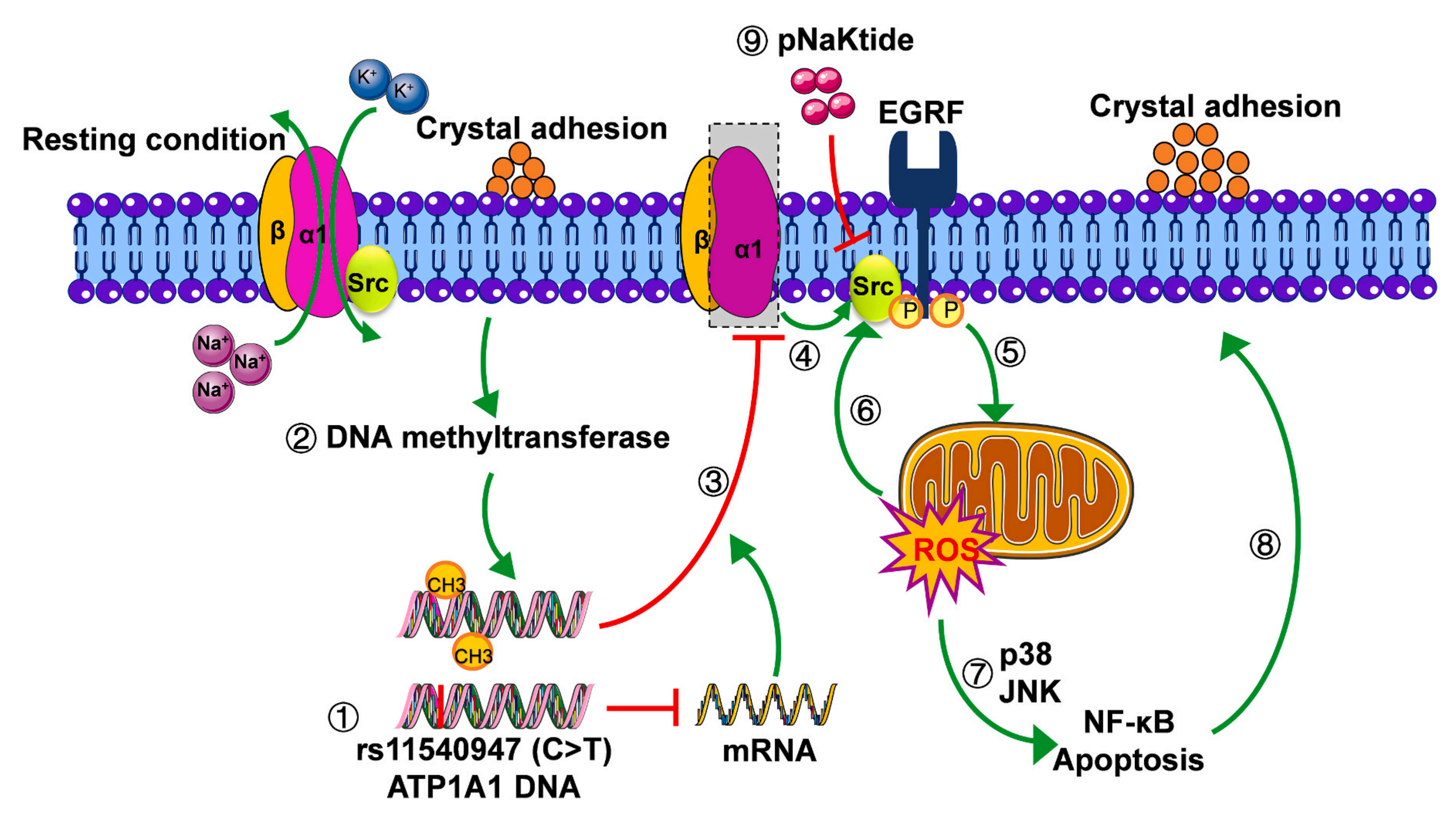 接下來(lái),該研究從WES數據中提取了ATP1A1的SNP,rs11540947 T等位基因在患者組中的突變頻率頻率為16.1%,而對照組僅為2.4%。為進(jìn)一步證實(shí)rs11540947與鈣結石形成的相關(guān)性,收集214例鈣結石患者和232例匹配對照,通過(guò)HRM分析檢測rs11540947的基因型,結果顯示,CT+TT攜帶者在患者中比對照組更常見(jiàn),且在男性中與鈣結石有關(guān),但在女性中無(wú)顯著(zhù)相關(guān)性,SNPrs11540947 (NM_000701:c.-78C > T)位于?ATP1A1?的 5′UTR 中;在A(yíng)TP1A1的5′UTR中發(fā)現了Sp1結合位點(diǎn)和潛在的TATA盒,表明5′UTR具有啟動(dòng)子活性,雙熒光素酶報告基因結果也證明了這一點(diǎn),rs11540947的T等位基因介導了ATP1A1啟動(dòng)子活性的顯著(zhù)降低,這可能會(huì )降低ATP1A1在轉錄水平的表達。對草酸鈣一水合物(COM)暴露處理的HK2細胞(人腎近曲小管上皮細胞)進(jìn)行指標測定,結果顯示處理3h后,NKA酶活性和ATP1A1 mRNA水平顯著(zhù)下降,6h后ATP1A1的蛋白水平升高,隨后降低,同時(shí)COM 暴露后細胞內 ROS 水平顯著(zhù)增加,這可能與ATP1A1/Src信號通路的激活有關(guān),而ATP1A1的過(guò)表達抑制了COM誘導的Src、p38、JNK、p65和p50激活;WB結果也顯示COM激活的半胱天冬酶3被ATP1A1的過(guò)表達以及ATP1A1/Src信號復合物的特異性拮抗劑pNaKtide顯著(zhù)抑制,從而阻斷了細胞凋亡過(guò)程。