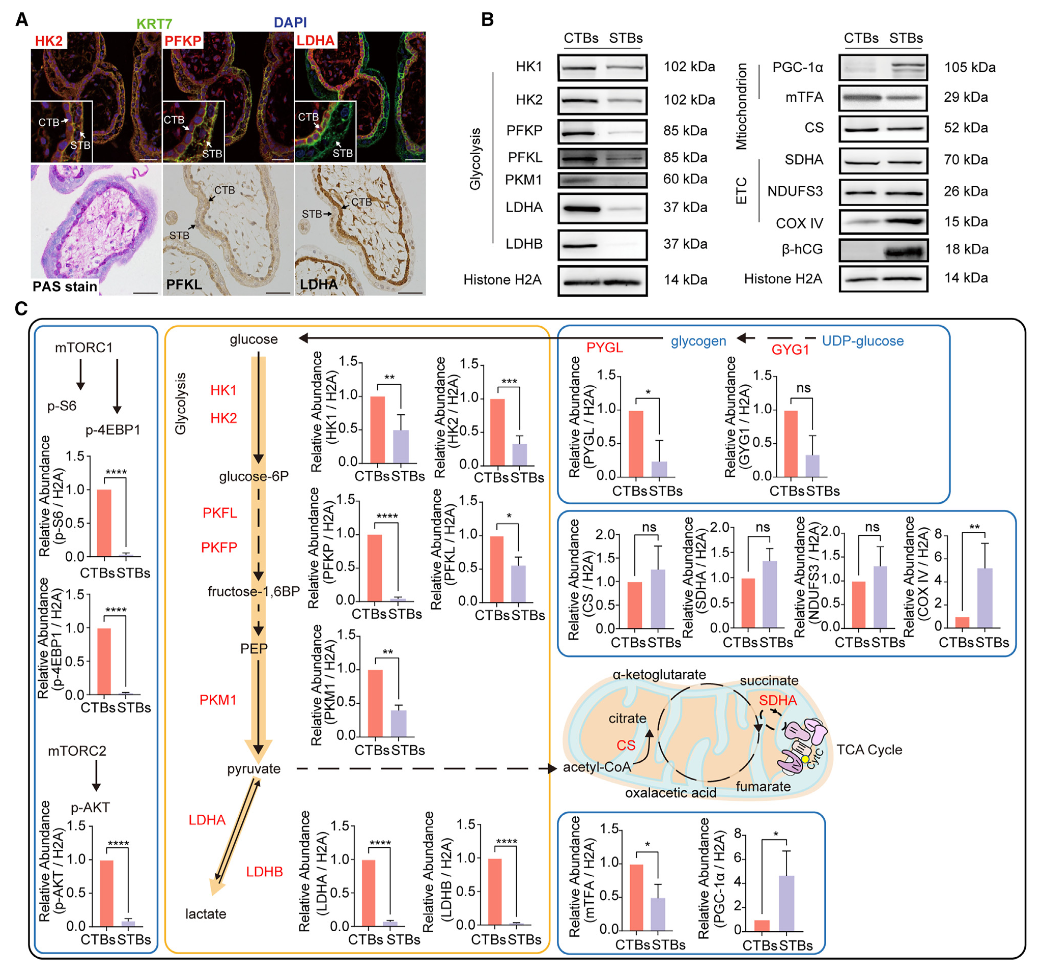 通過(guò)免疫組織化學(xué)和免疫熒光染色在孕早期人類(lèi)胎盤(pán)絨毛組織中,證實(shí)了許多關(guān)鍵的糖酵解酶,包括己糖激酶2 (HK2)、磷酸果糖激酶、血小板型(PFKP)、磷酸果糖激酶、肝型(PFKL)和乳酸脫氫酶A (LDHA),確實(shí)在CTBs中比體內STBs更廣泛地表達(圖1A)。通過(guò)實(shí)時(shí)qPCR和免疫印跡(圖1B)繪制關(guān)鍵代謝酶的變化。結果顯示,糖酵解酶,包括己糖激酶1 (HK1)、HK2、PFKP、PFKL、丙酮酸激酶M1 (PKM1)、LDHA和乳酸脫氫酶B (LDHB), CTBs均顯著(zhù)高于STBs(圖1B和1C)。線(xiàn)粒體生物發(fā)生相關(guān)轉錄因子PGC1a和細胞色素氧化酶(COX) IV在STBs中高表達,而糖原代謝酶肝糖原磷酸化酶(PYGL)和糖原1 (GYG1)在CTBs中高于STBs(圖1C),與糖原的周期性酸-希夫(PAS)染色一致(圖1A)。在主要調控糖酵解酶的磷脂酰肌醇3-激酶(PI3K)-哺乳動(dòng)物雷帕霉素靶蛋白(mTOR)通路中,CTBs中蛋白激酶B (AKT)、核糖體蛋白S6 (S6)和真核翻譯起始因子4E (4EBP1)的磷酸化水平顯著(zhù)高于STBs(圖1C左)。這些結果表明,糖酵解和糖原溶解的糖代謝途徑在合胞滋養細胞中顯著(zhù)減少,而OxPhos水平基本保持不變。