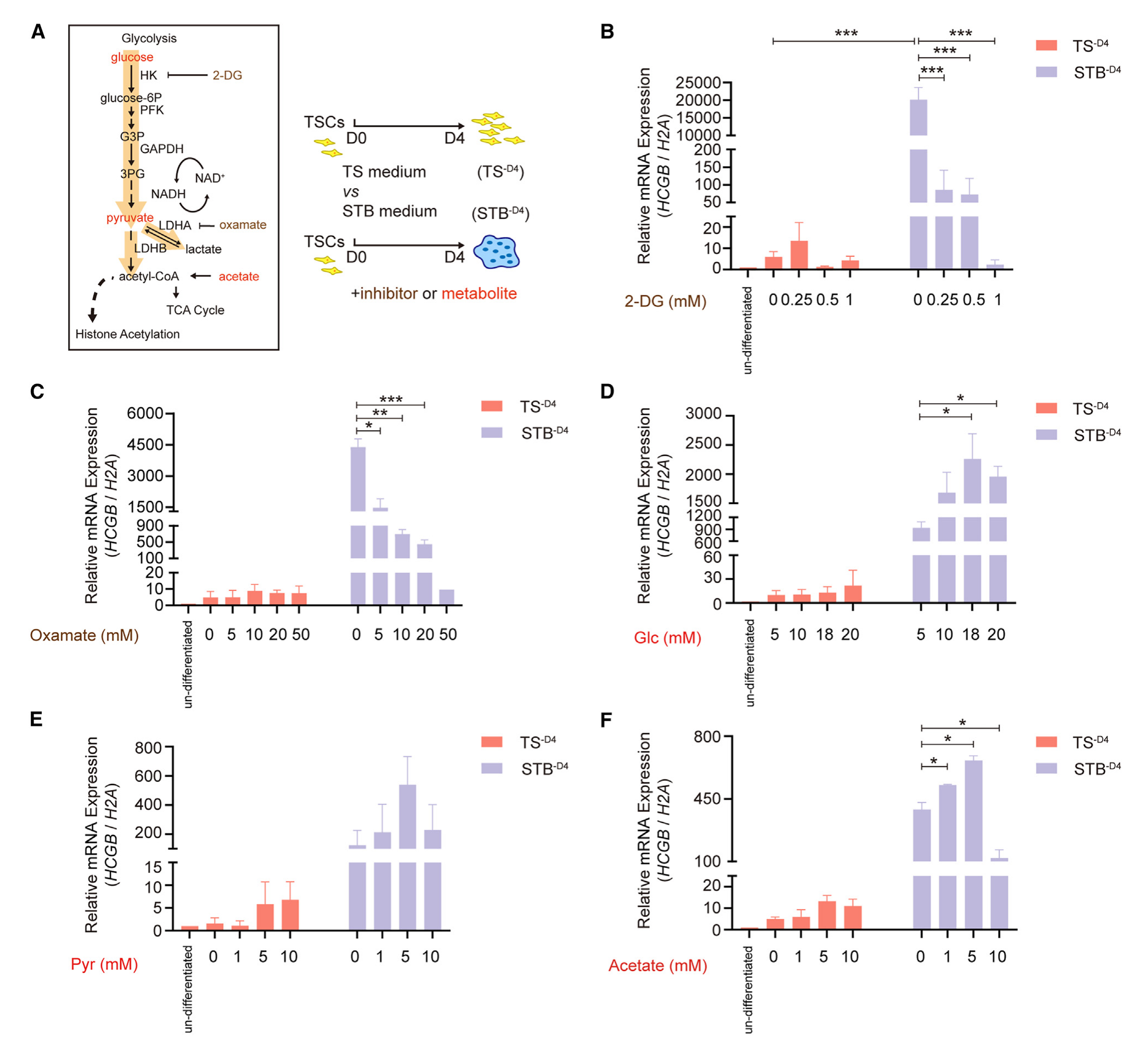 接下來(lái),該研究使用糖酵解的關(guān)鍵代謝物,包括葡萄糖、丙酮酸和醋酸酯(用于補充細胞內乙酰輔酶A),來(lái)探索糖酵解代謝物對人滋養細胞合胞的影響。結果表明,隨著(zhù)葡萄糖濃度的增加,從5到18 mM,STB-D4細胞中HCGB以及SDC1、ERVFRD1、ERVW1、GCM1、PSG4和CYP19A1的表達逐漸增強,滋養細胞的合胞化程度逐漸增強(圖3D)。丙酮酸處理在未分化的hTSCs和正在合胞的hTSCs中導致了類(lèi)似的反應,即一定濃度范圍內(10 mM)的代謝物增加了滋養細胞的合胞 (圖3E)。同樣,在一定濃度范圍內,乙酸也顯著(zhù)促進(jìn)滋養細胞合胞(圖3F),在超高濃度下,HCGB、GCM1、PSG4和CYP19A1被顯著(zhù)抑制(圖3)。特別指出,糖酵解藥物和中間體對HTSCs和STBs的合胞有特異性作用,但對未分化的htsc沒(méi)有特異性作用。因此,涉及STB特異性信號傳導,并且調節滋養層合胞化可能需要較佳水平的基礎糖酵解物質(zhì)。